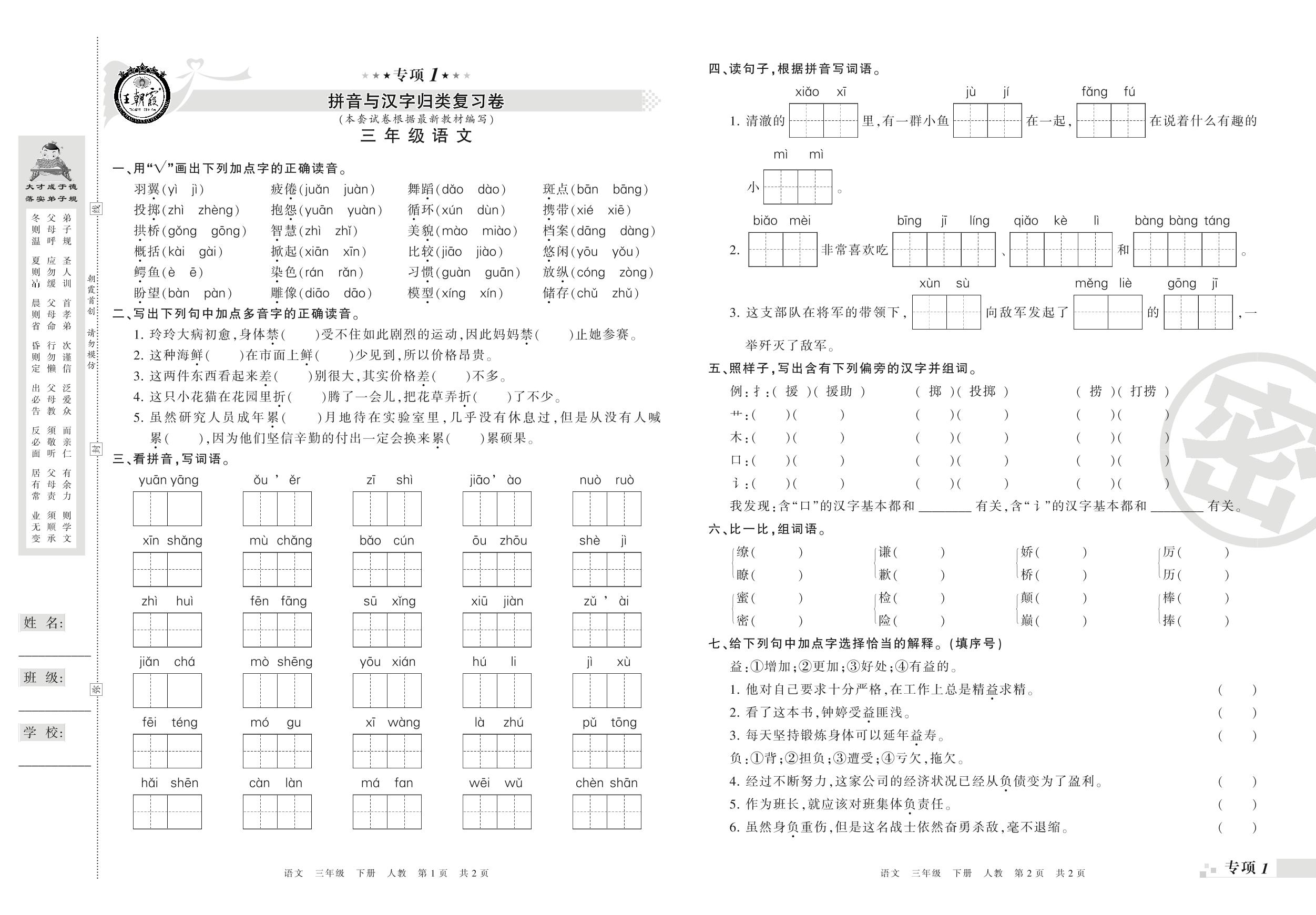 王朝霞期末专项卷——拼音与汉字、词语归类复习三年级下册语文(人教版)_R21080194519001【0】