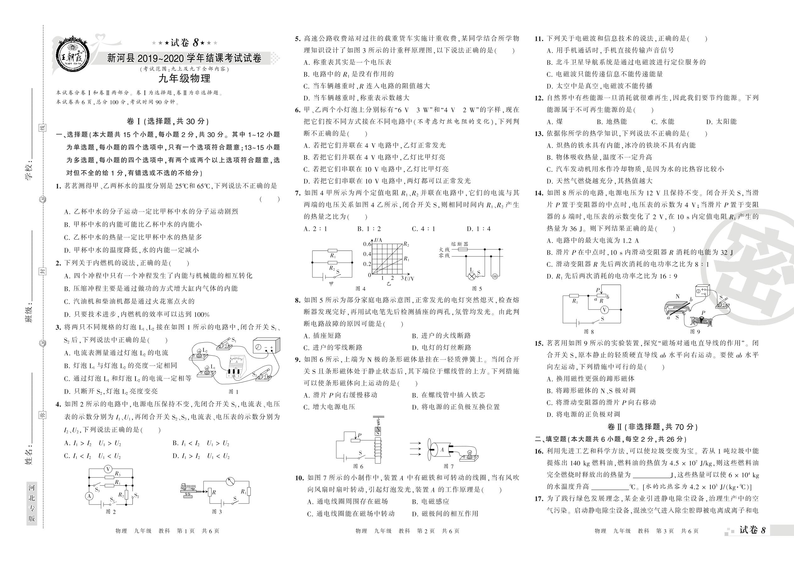 2019-2020学年第一学期邢台市新河县九年级物理试卷(教科版)【8】