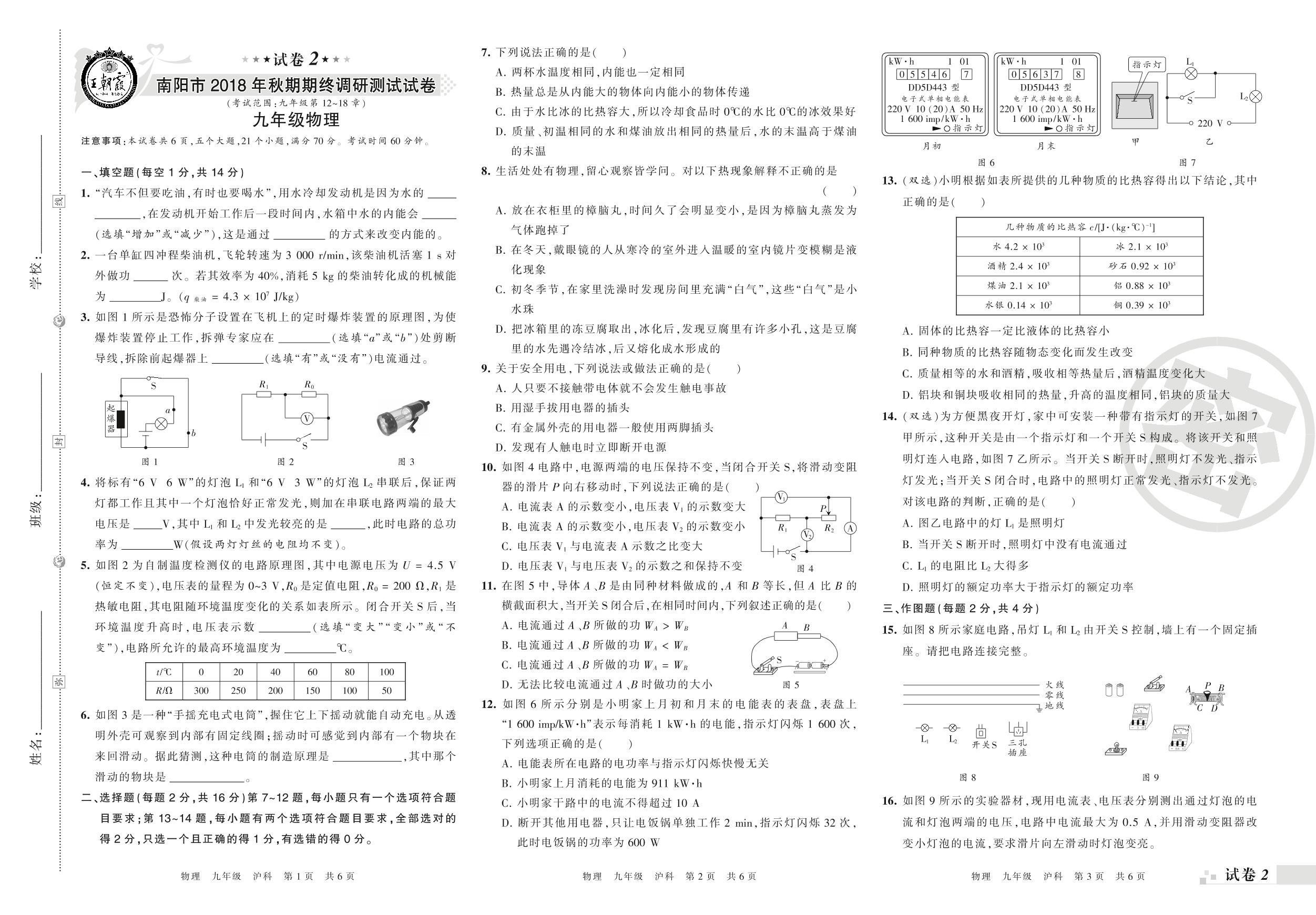 2018-2019学年第一学期南阳市九年级物理试卷(沪科版)【2】