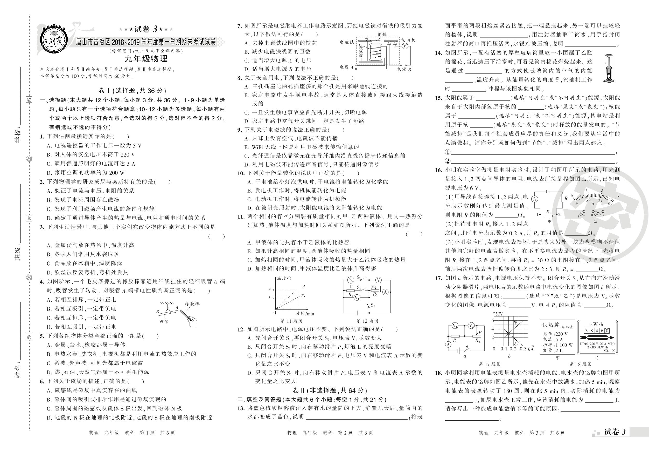 2018-2019学年第一学期唐山市古冶区九年级物理试卷(教科版)【3】