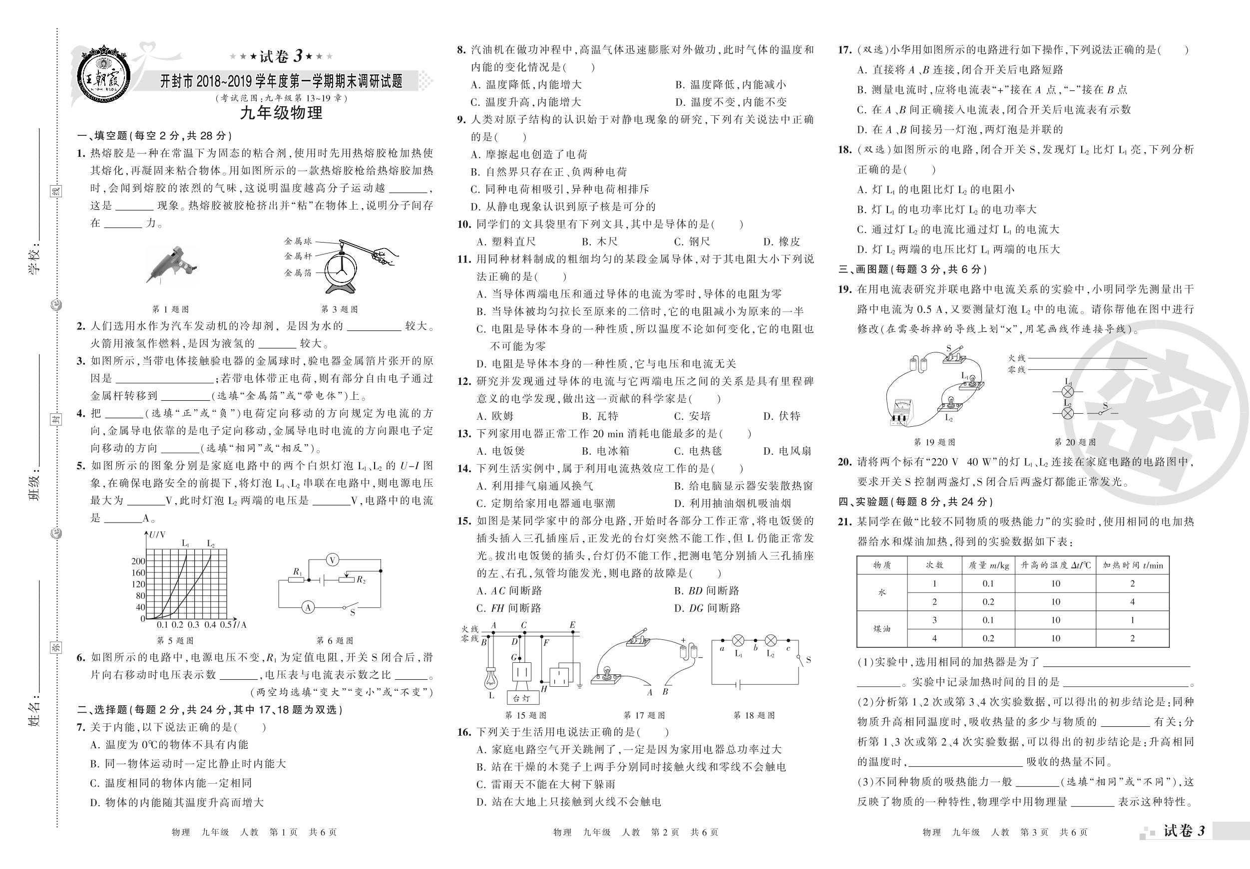 2018-2019学年第一学期开封市九年级物理试卷(人教版)【3】