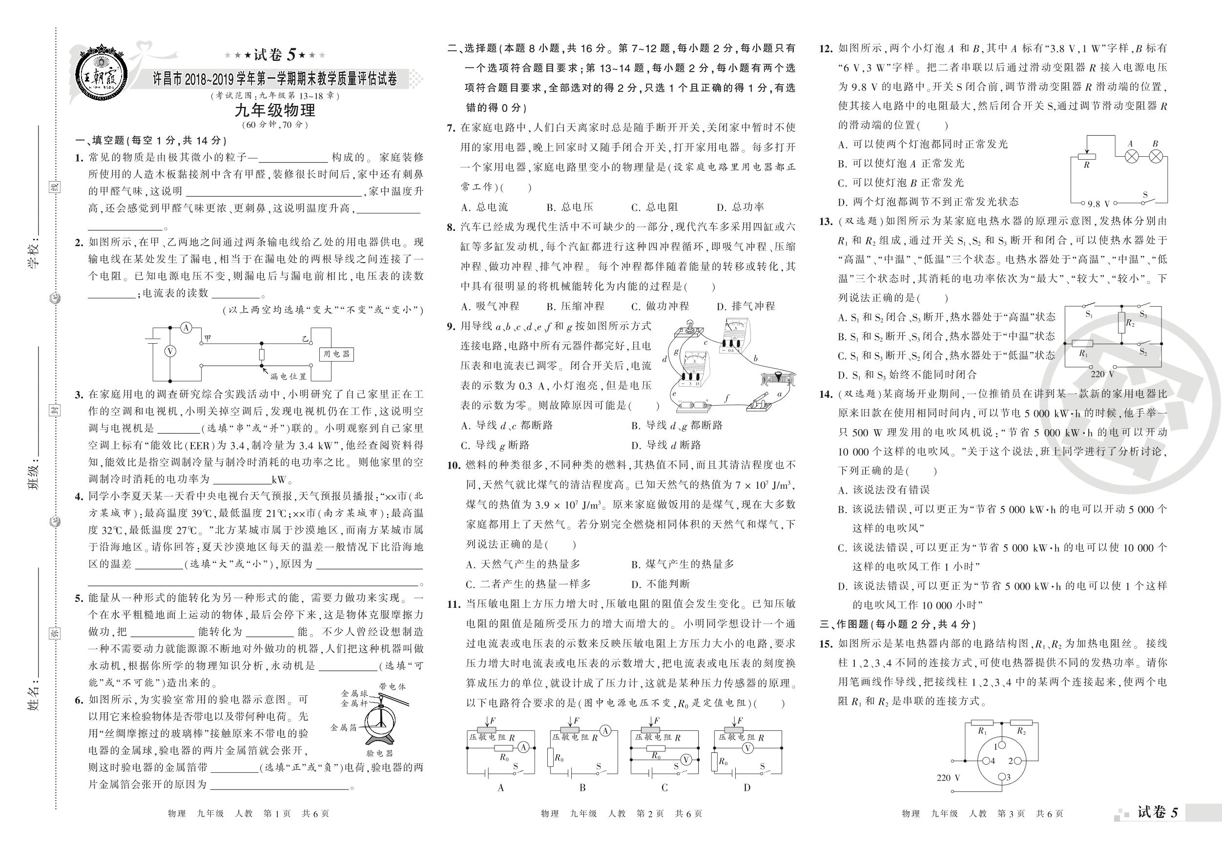 2018-2019学年第一学期许昌市九年级物理试卷(人教版)【5】