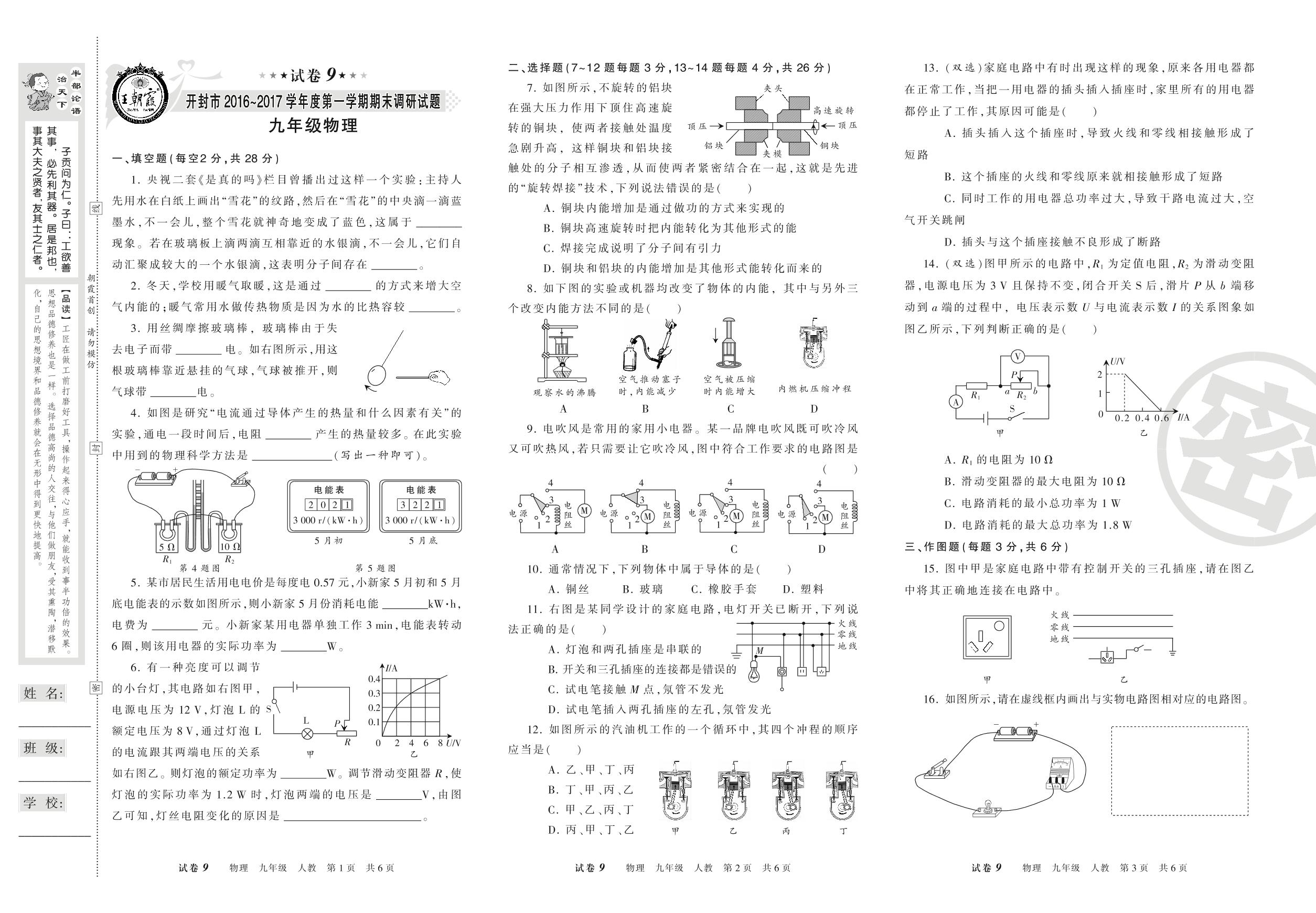 2016-2017学年第一学期开封市九年级物理试卷(人教版)【9】