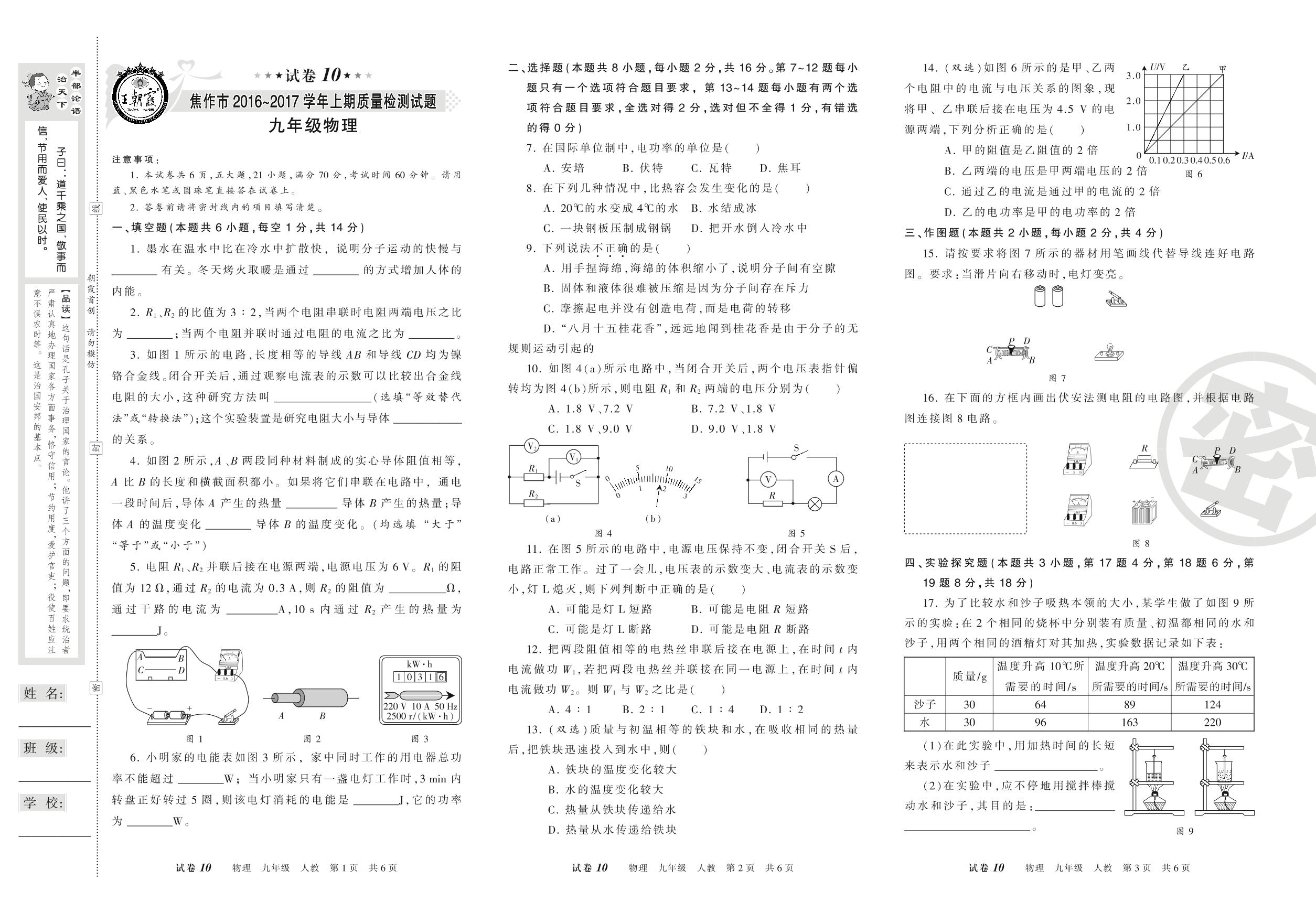2016-2017学年第一学期焦作市九年级物理试卷(人教版)【10】