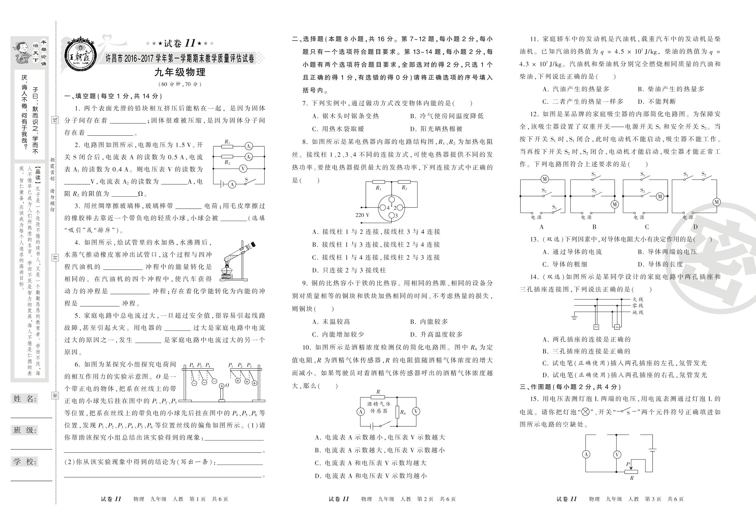 2016-2017学年第一学期许昌市九年级物理试卷(人教版)【11】