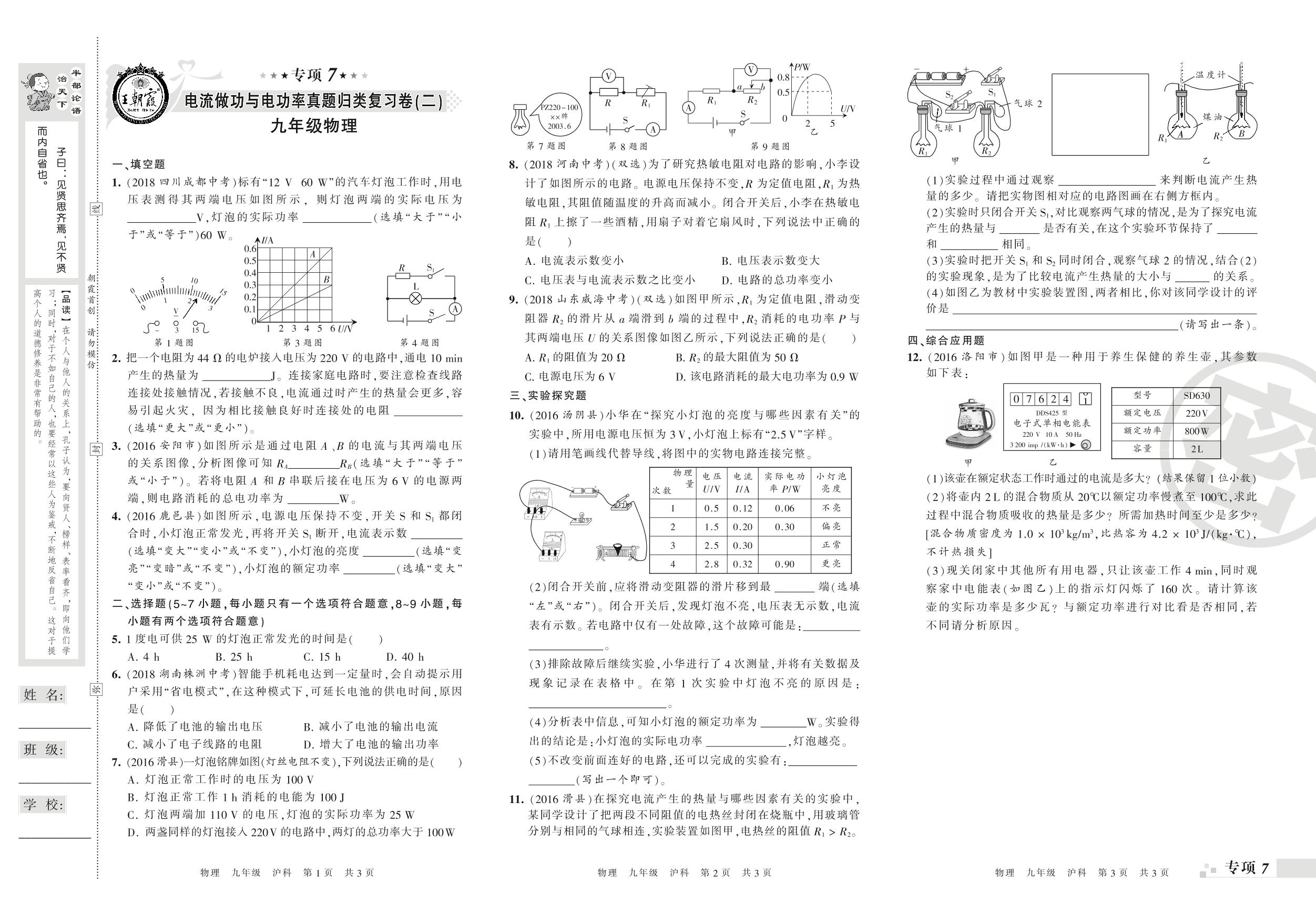 九年级物理沪科版上册专项卷