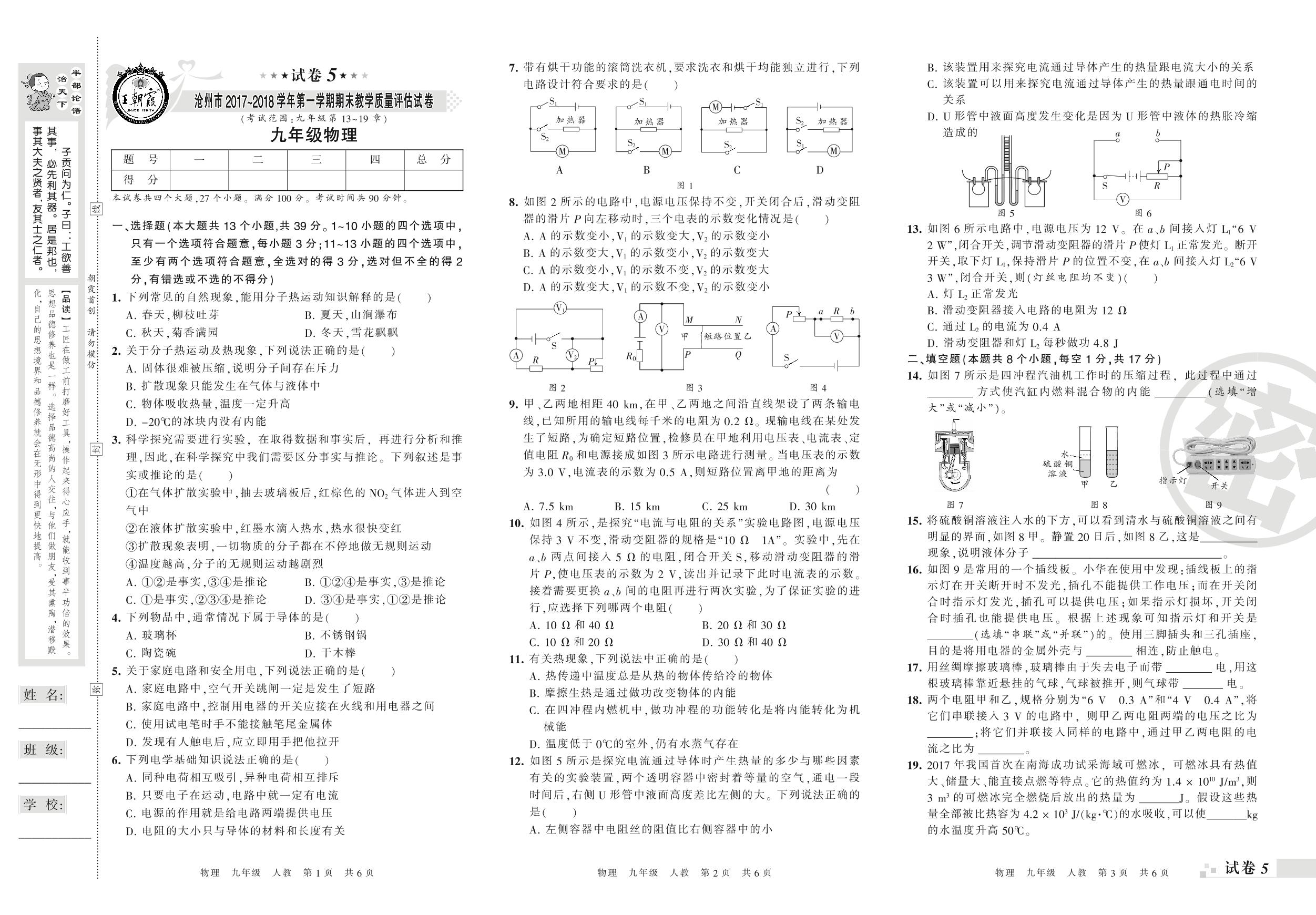 2017-2018学年第一学期沧州市九年级物理试卷(人教版)【5】