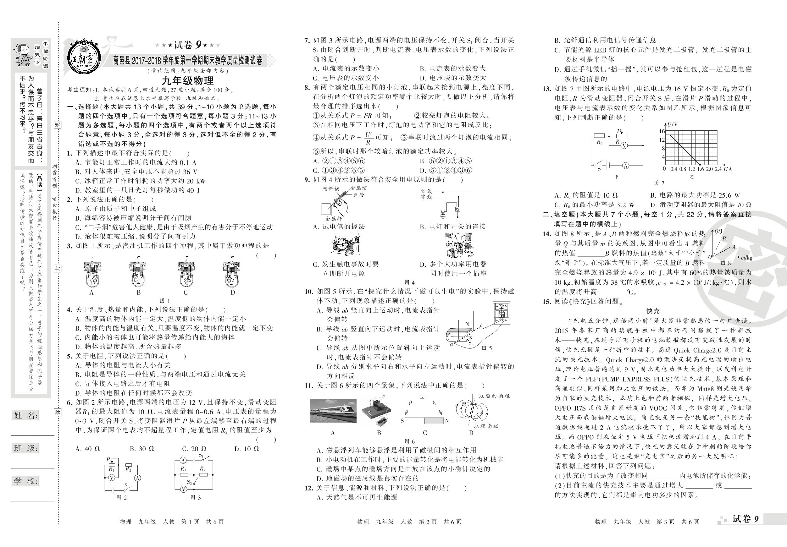 2017-2018学年第一学期石家庄市高邑县九年级物理试卷(人教版)【9】