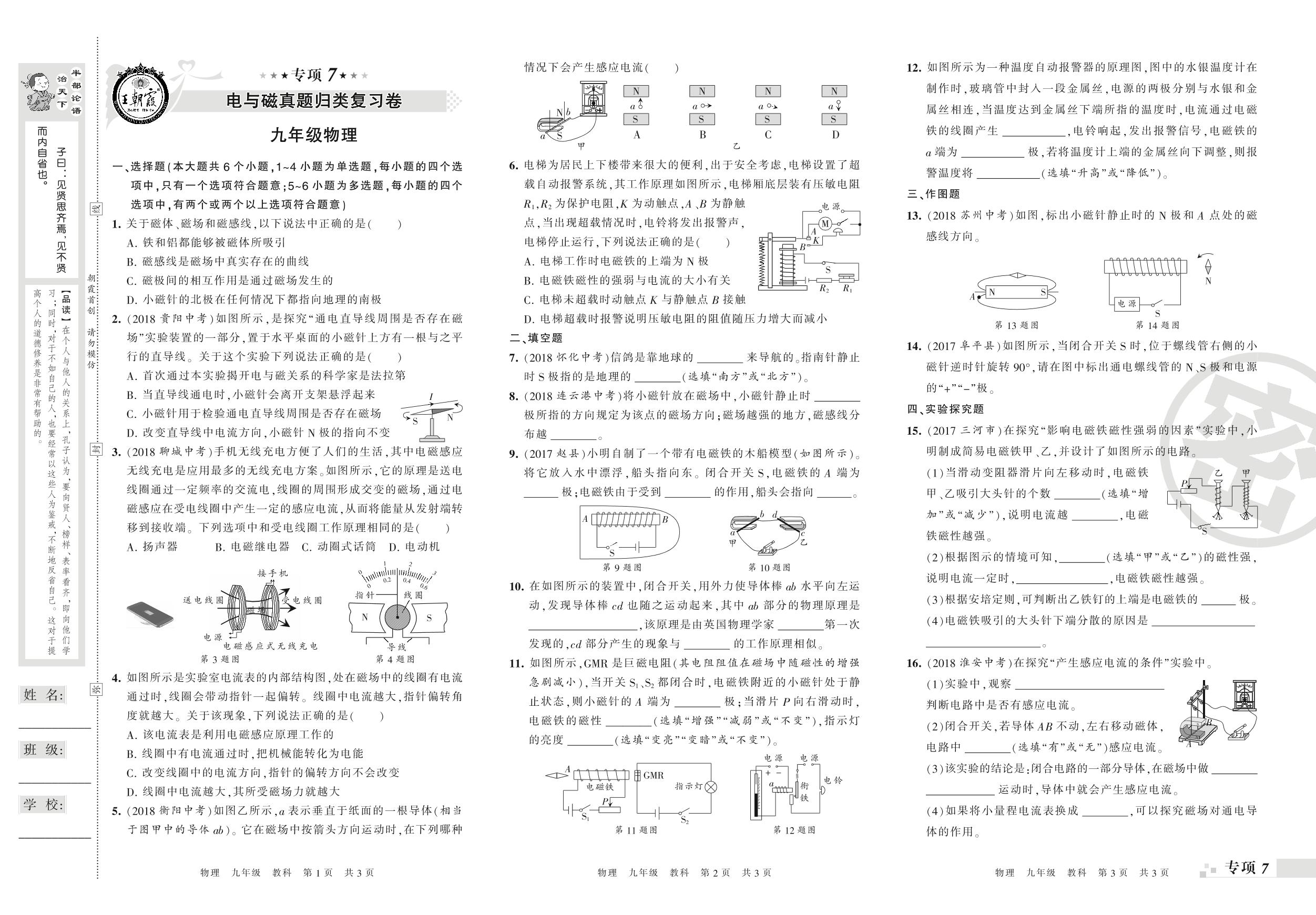 王朝霞期末专项卷——电与磁、家庭用电真题归类复习卷九年级上册物理(教科版)_R21081191028【0】
