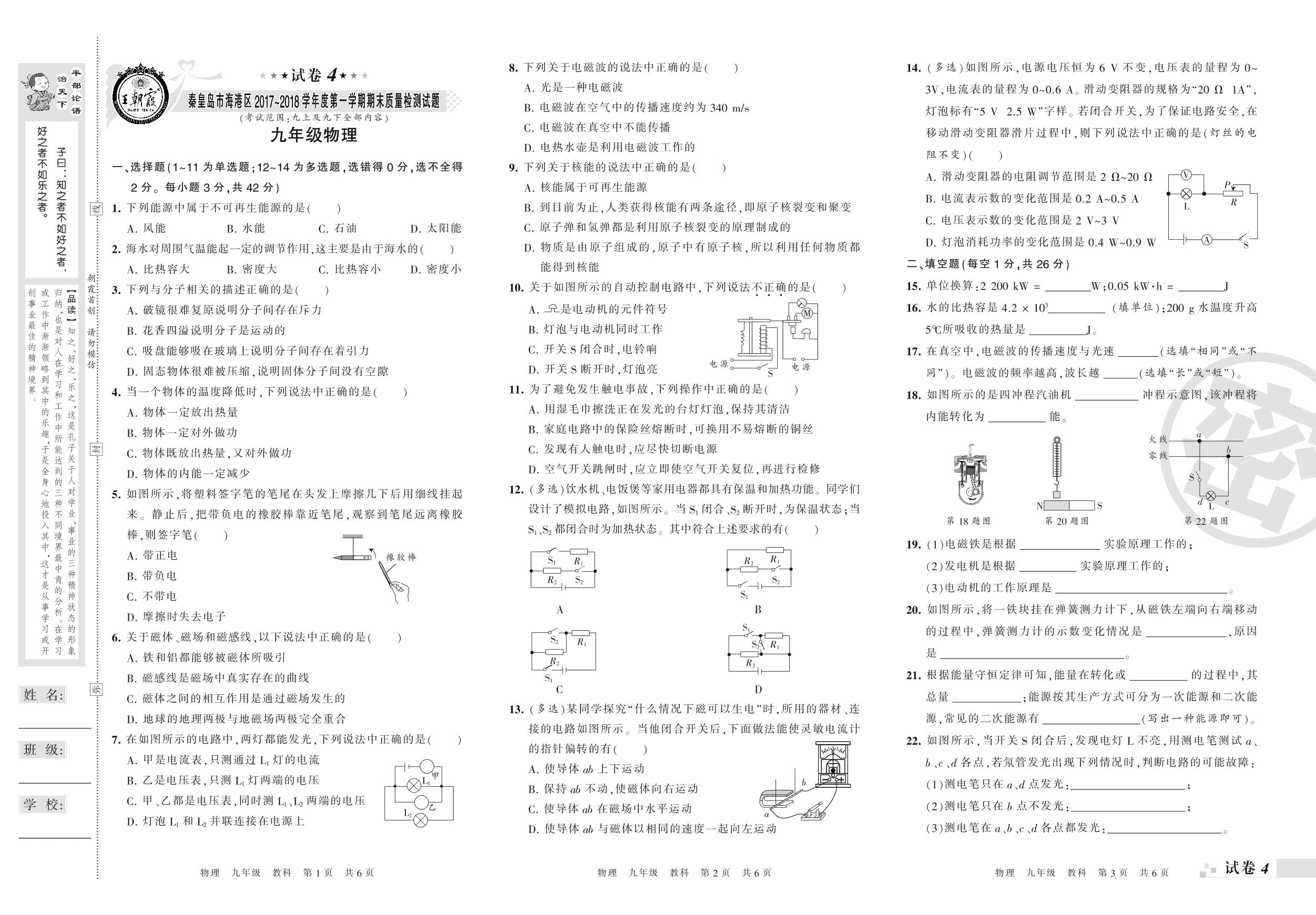 2017-2018学年第一学期秦皇岛市海港区九年级物理试卷(教科版)【4】