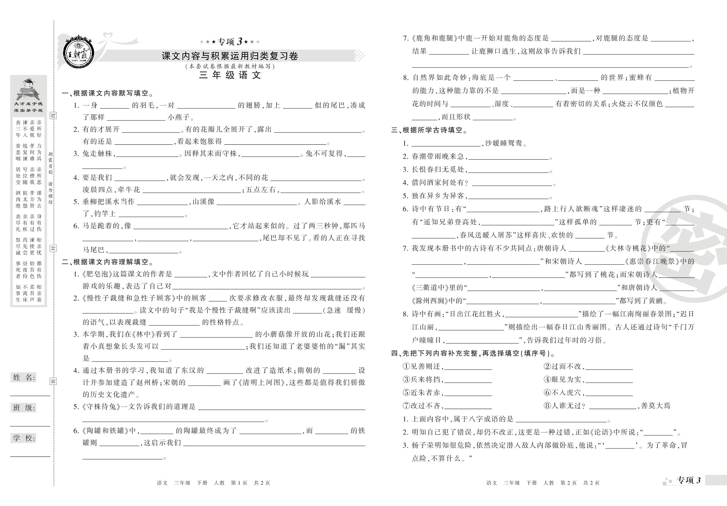 王朝霞期末专项卷——课文内容与积累运用、课内阅读与写作归类复习三年级下册语文(人教版)_R21080194538【0】