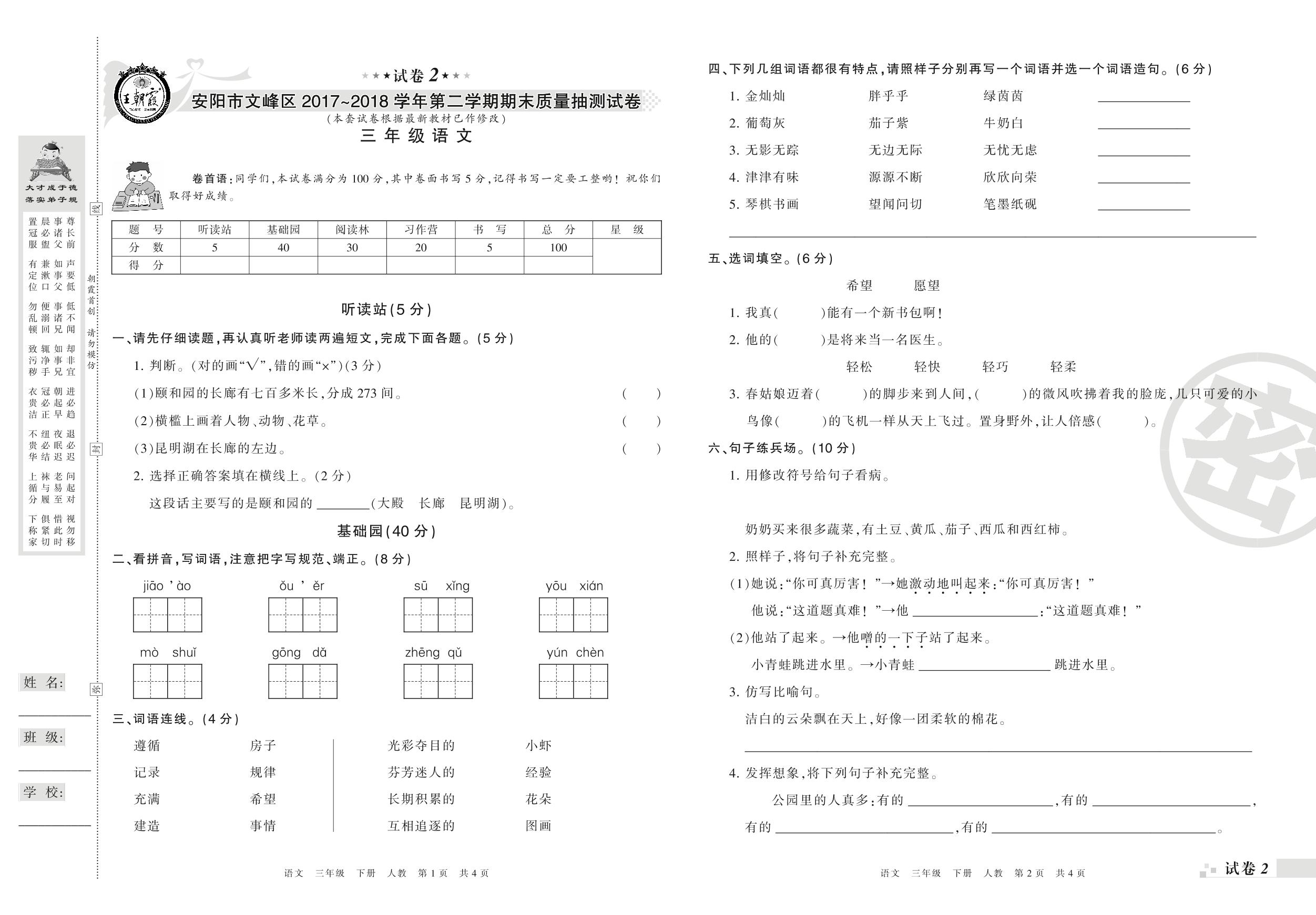 2017-2018学年第二学期安阳市文峰区三年级语文试卷(人教版)【2】