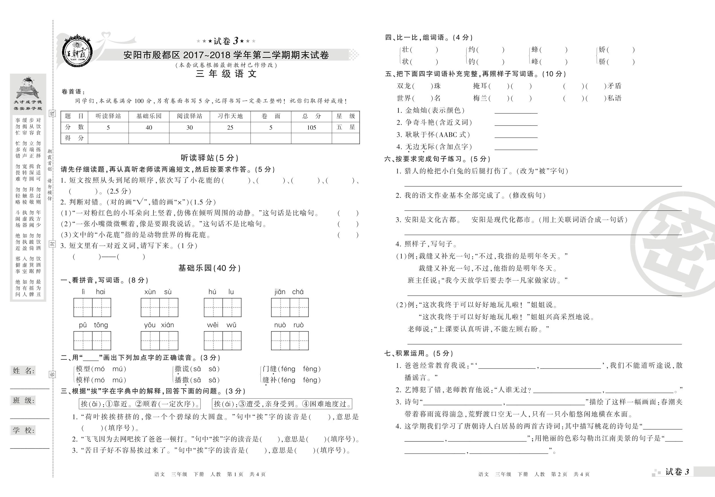 2017-2018学年第二学期安阳市殷都区三年级语文试卷(人教版)【3】