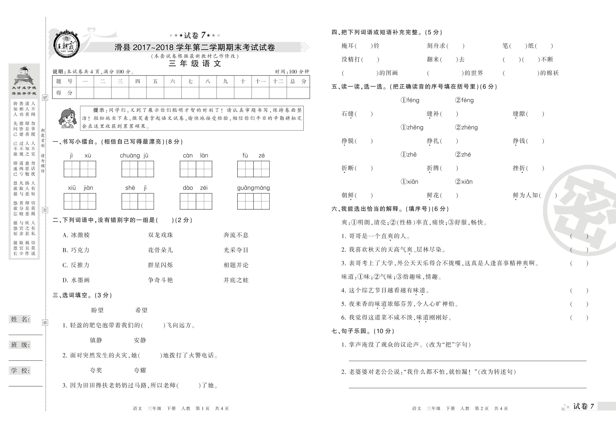 2017-2018学年第二学期安阳市滑县三年级语文试卷(人教版)【7】