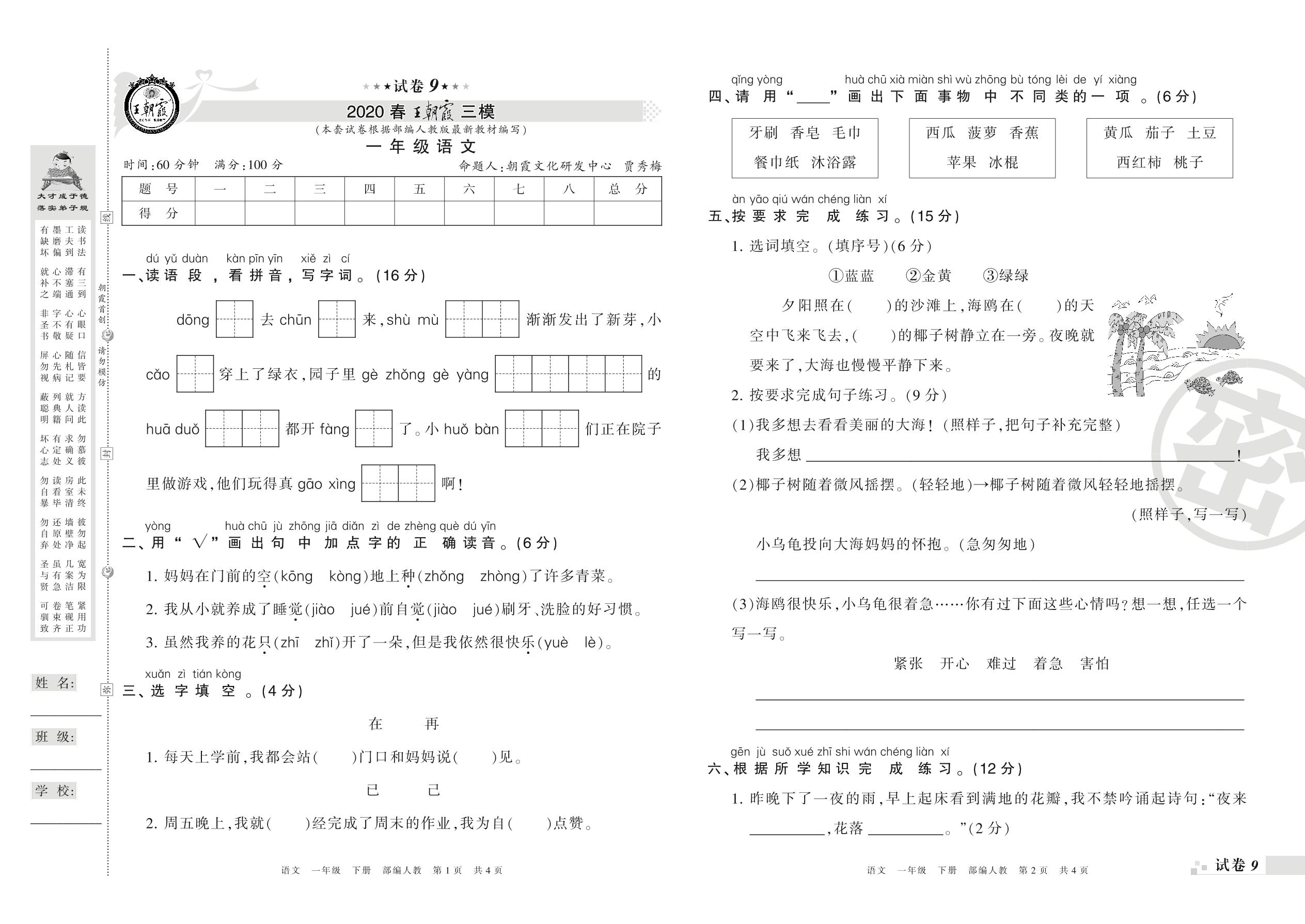 王朝霞期末模拟卷一年级下册语文(人教版)_R210731180024【9】