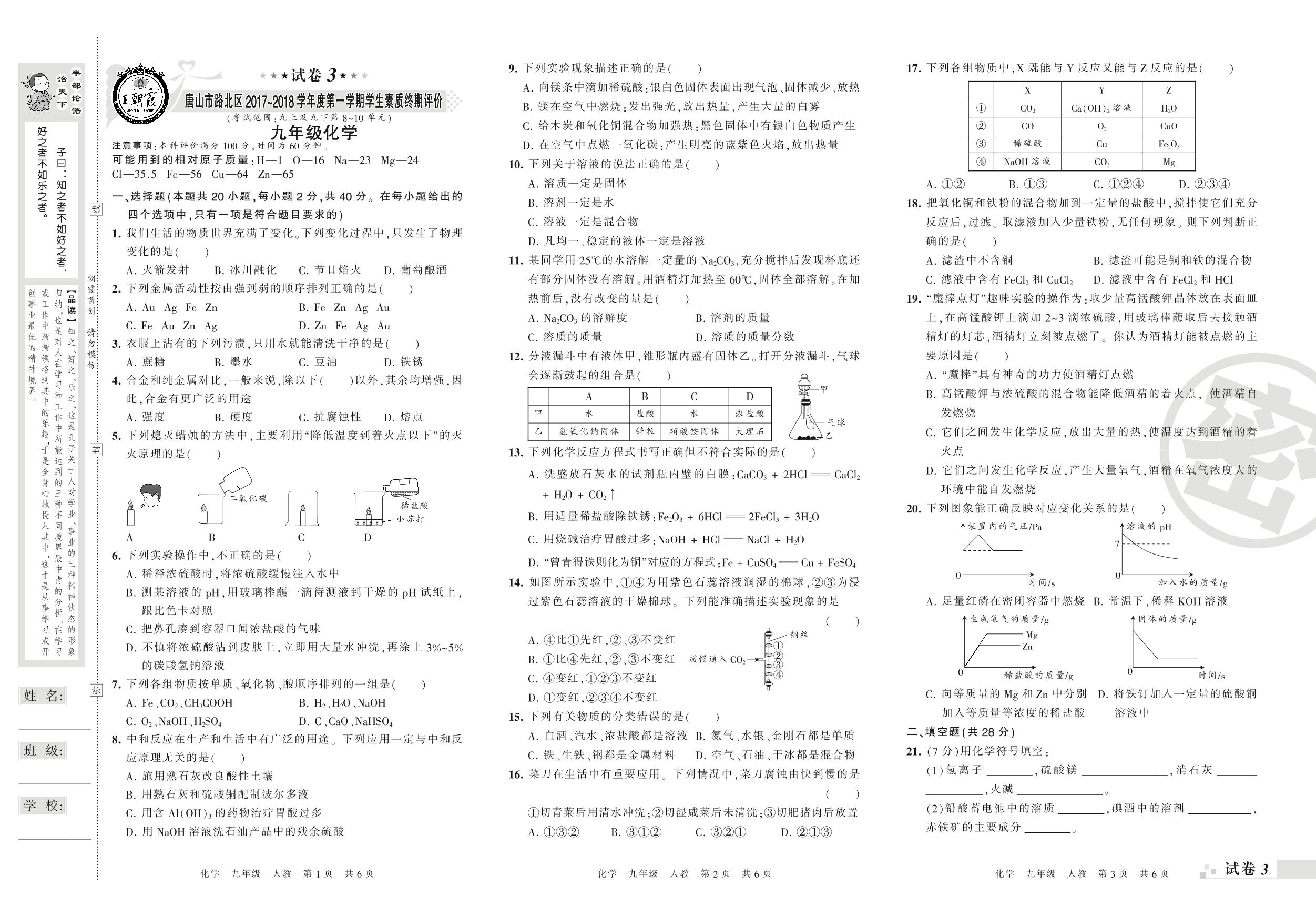 2017-2018学年第一学期唐山市路北区九年级化学试卷(人教版)【3】