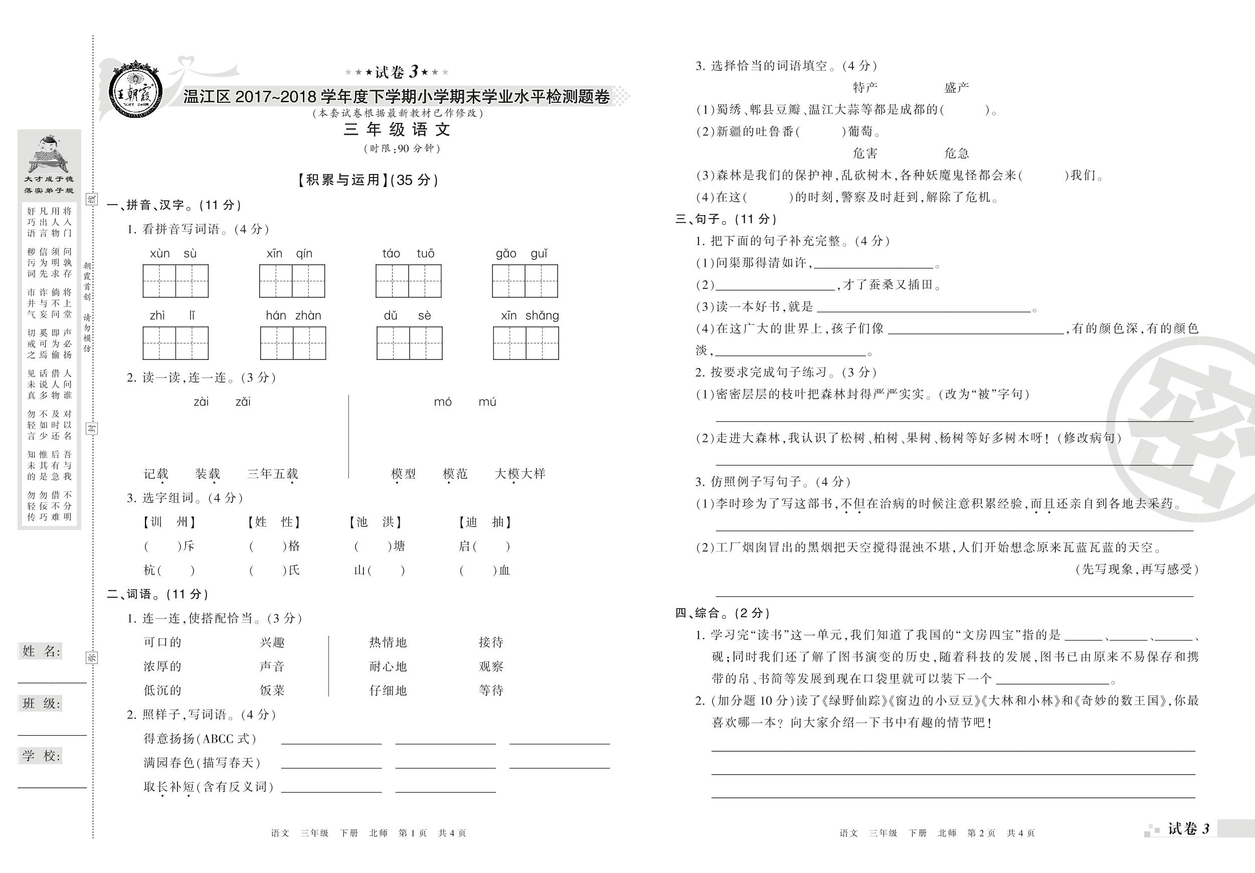 2017-2018学年第二学期成都市温江区三年级语文试卷(北师版)【3】