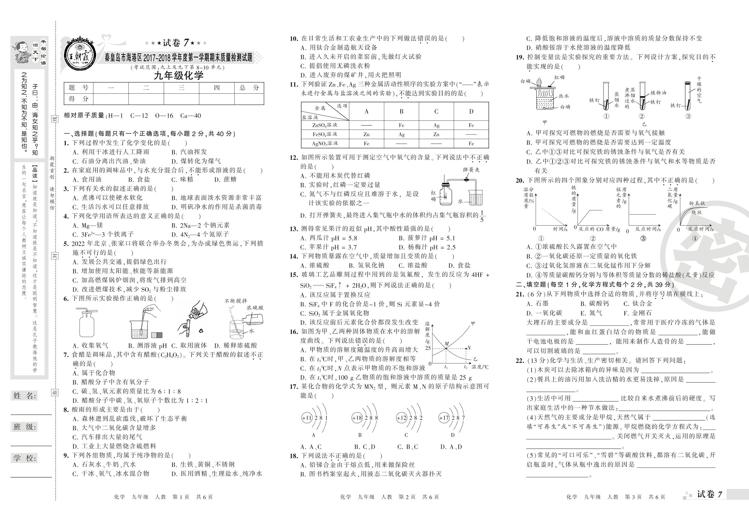 2017-2018学年第一学期秦皇岛市海港区九年级化学试卷(人教版)【7】