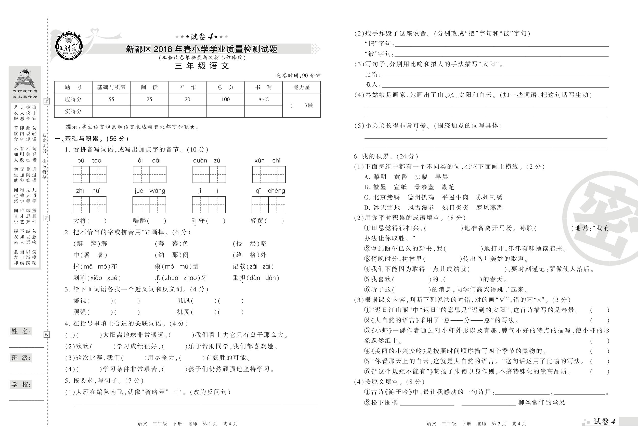 2017-2018学年第二学期成都市新都区三年级语文试卷(北师版)【4】