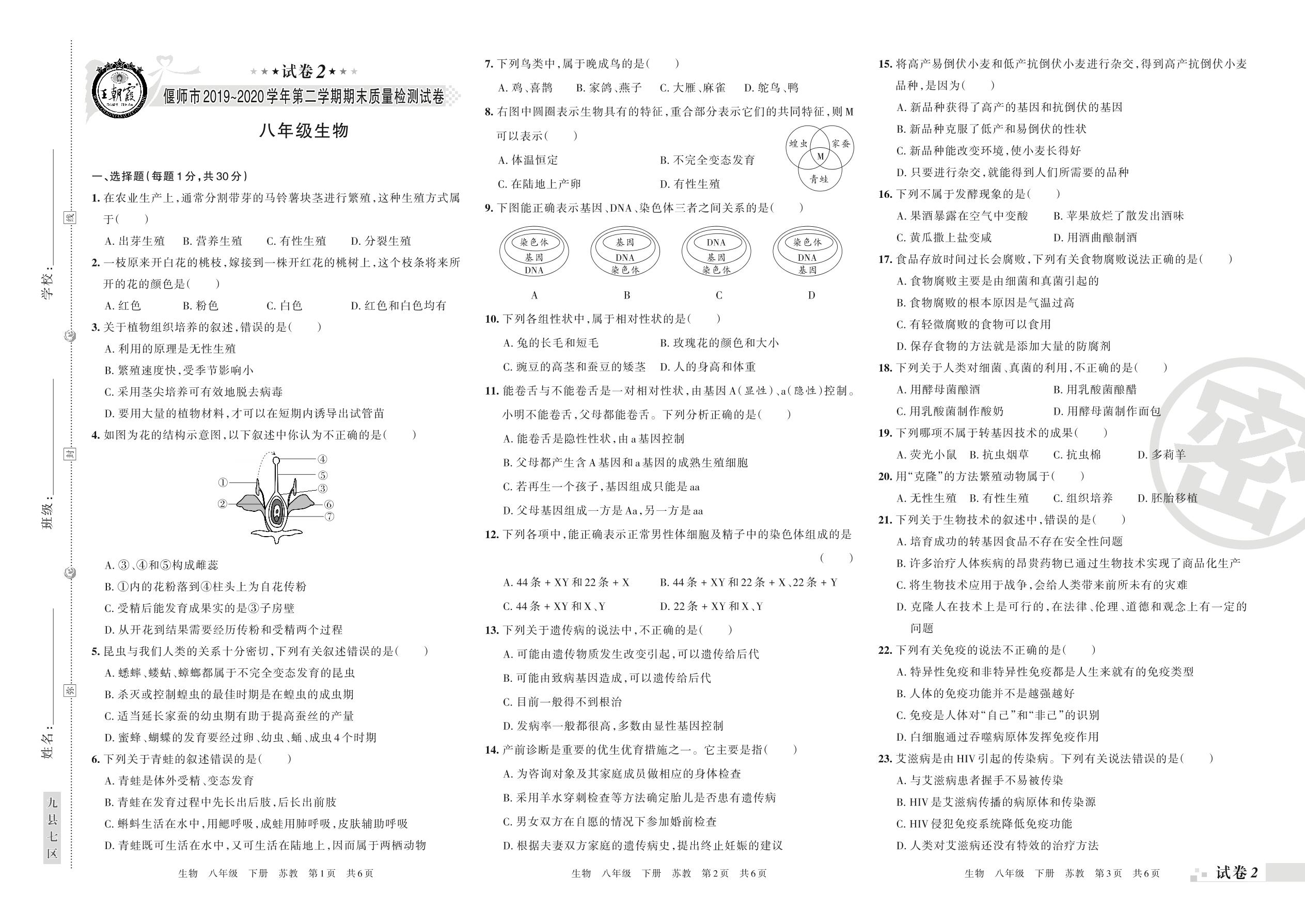 2019-2020学年第二学期偃师市八年级生物试卷(苏教版)【2】