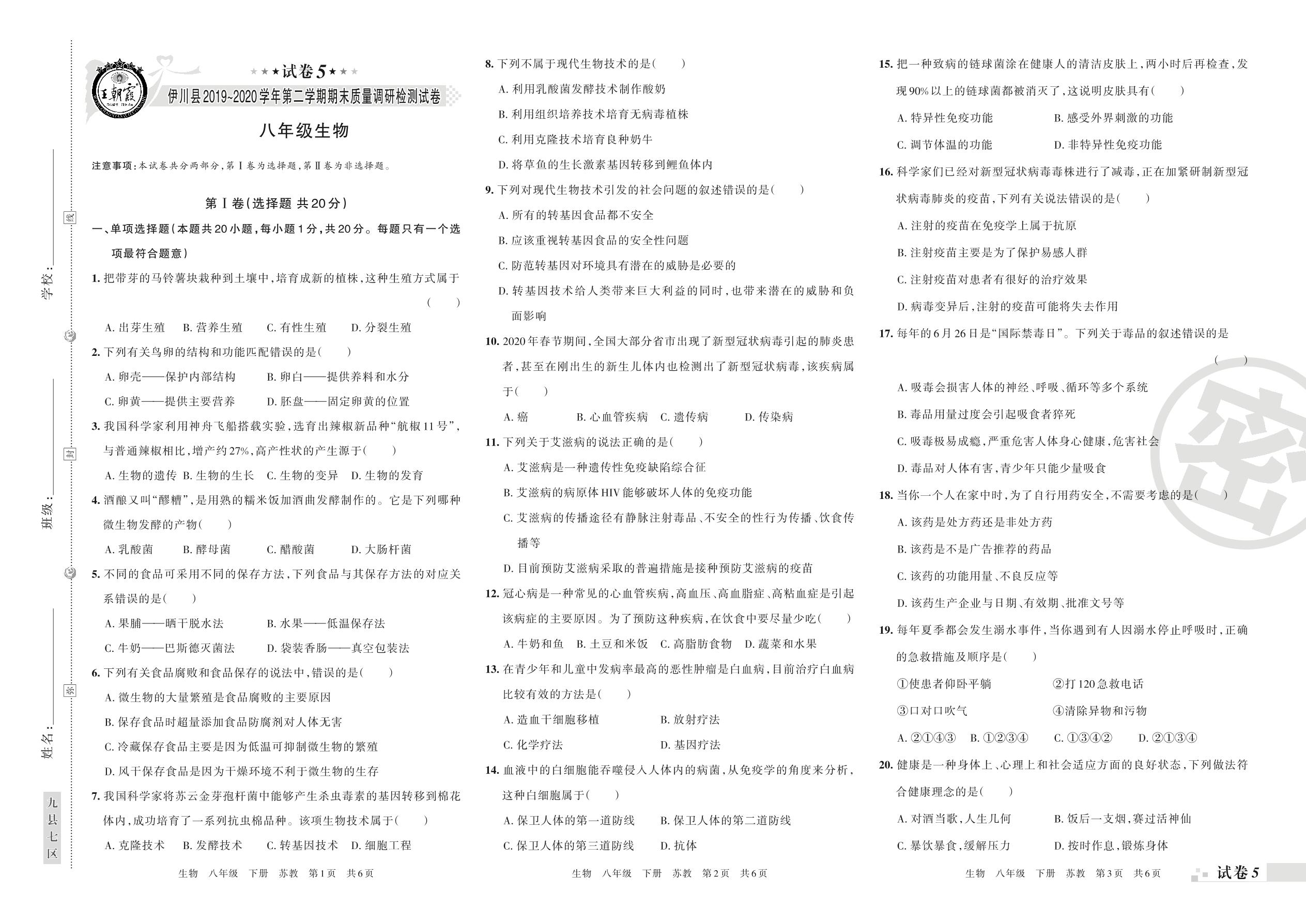 2019-2020学年第二学期洛阳市伊川县八年级生物试卷(苏教版)【5】