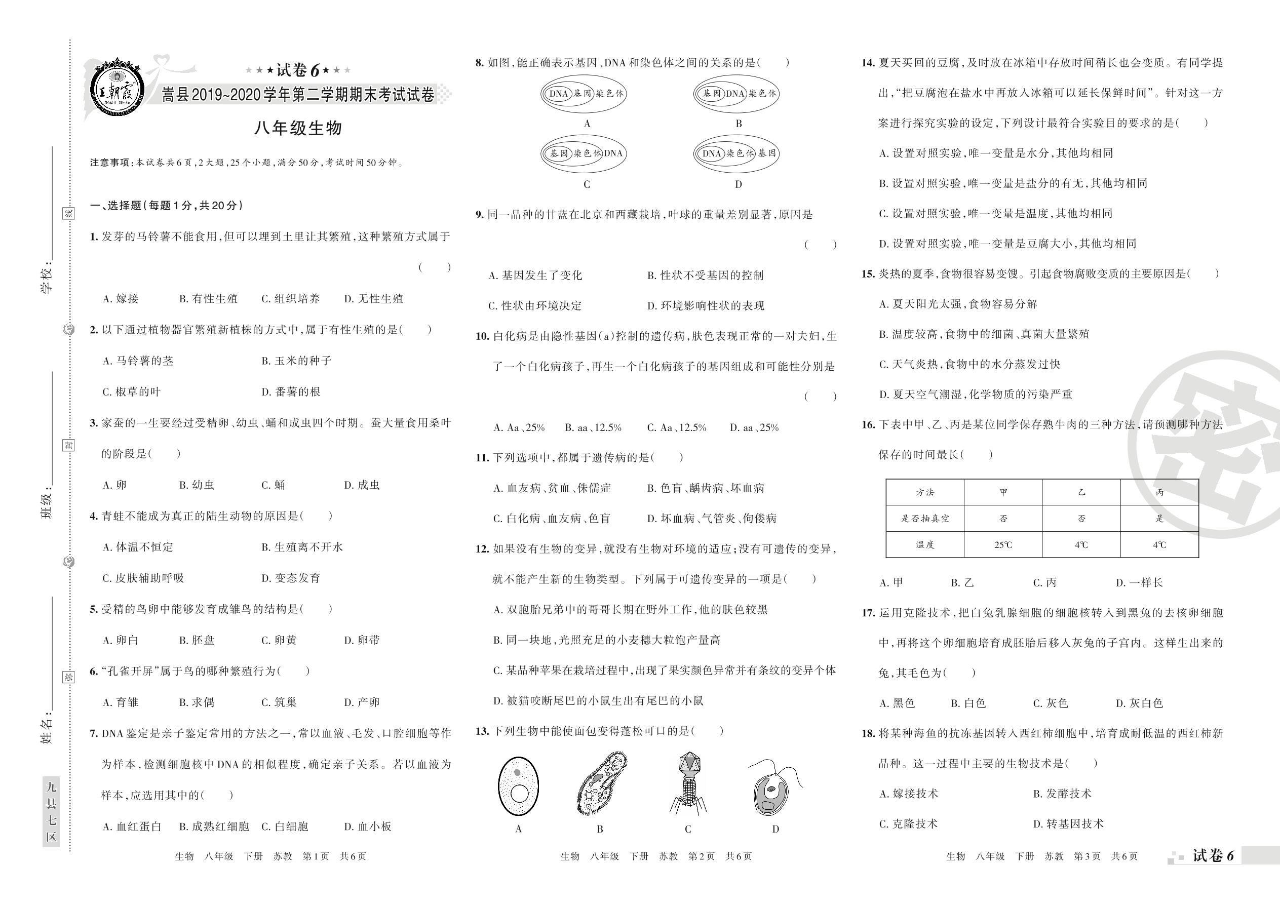2019-2020学年第二学期洛阳市嵩县八年级生物试卷(苏教版)【6】