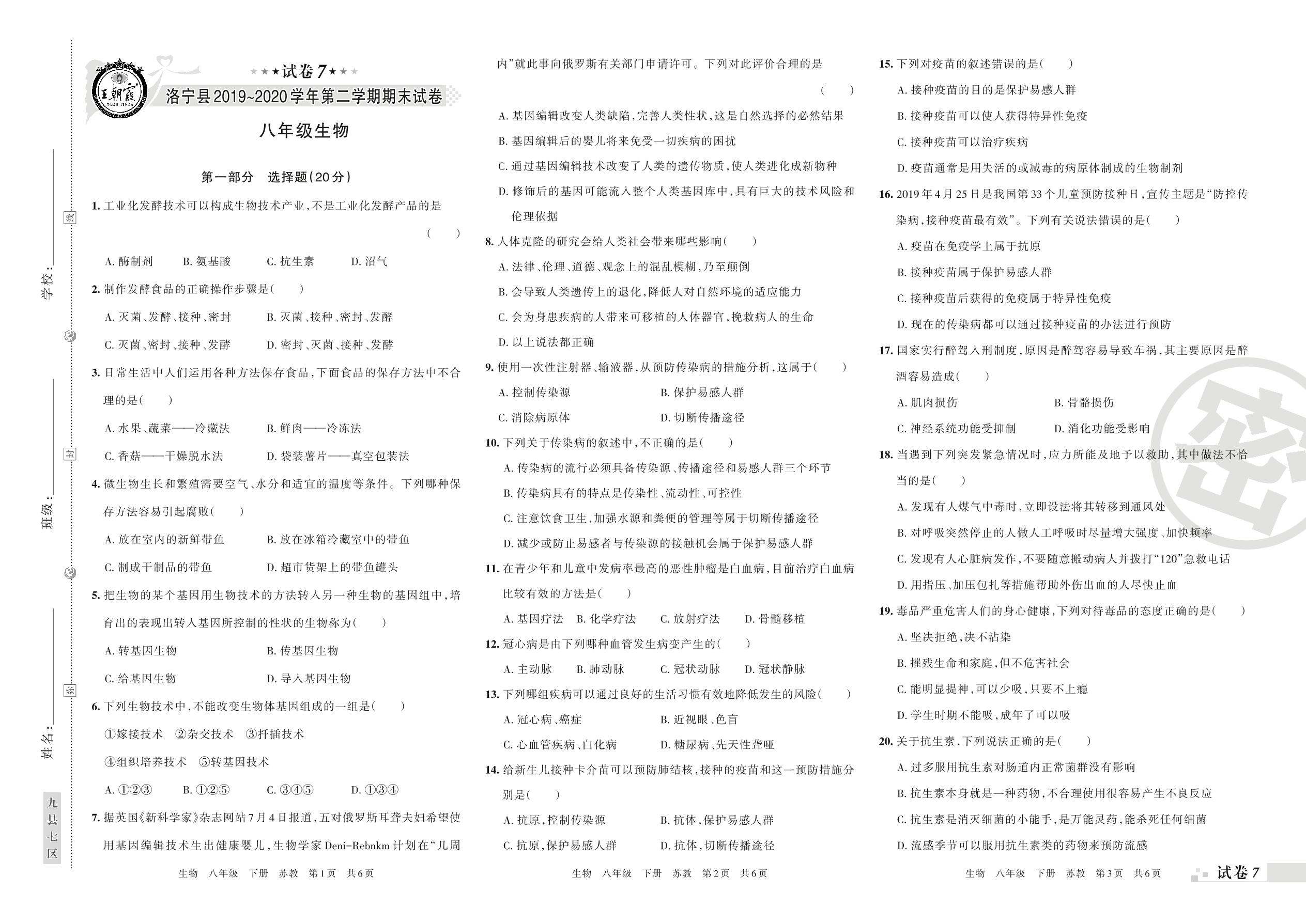 2019-2020学年第二学期洛阳市洛宁县八年级生物试卷(苏教版)【7】