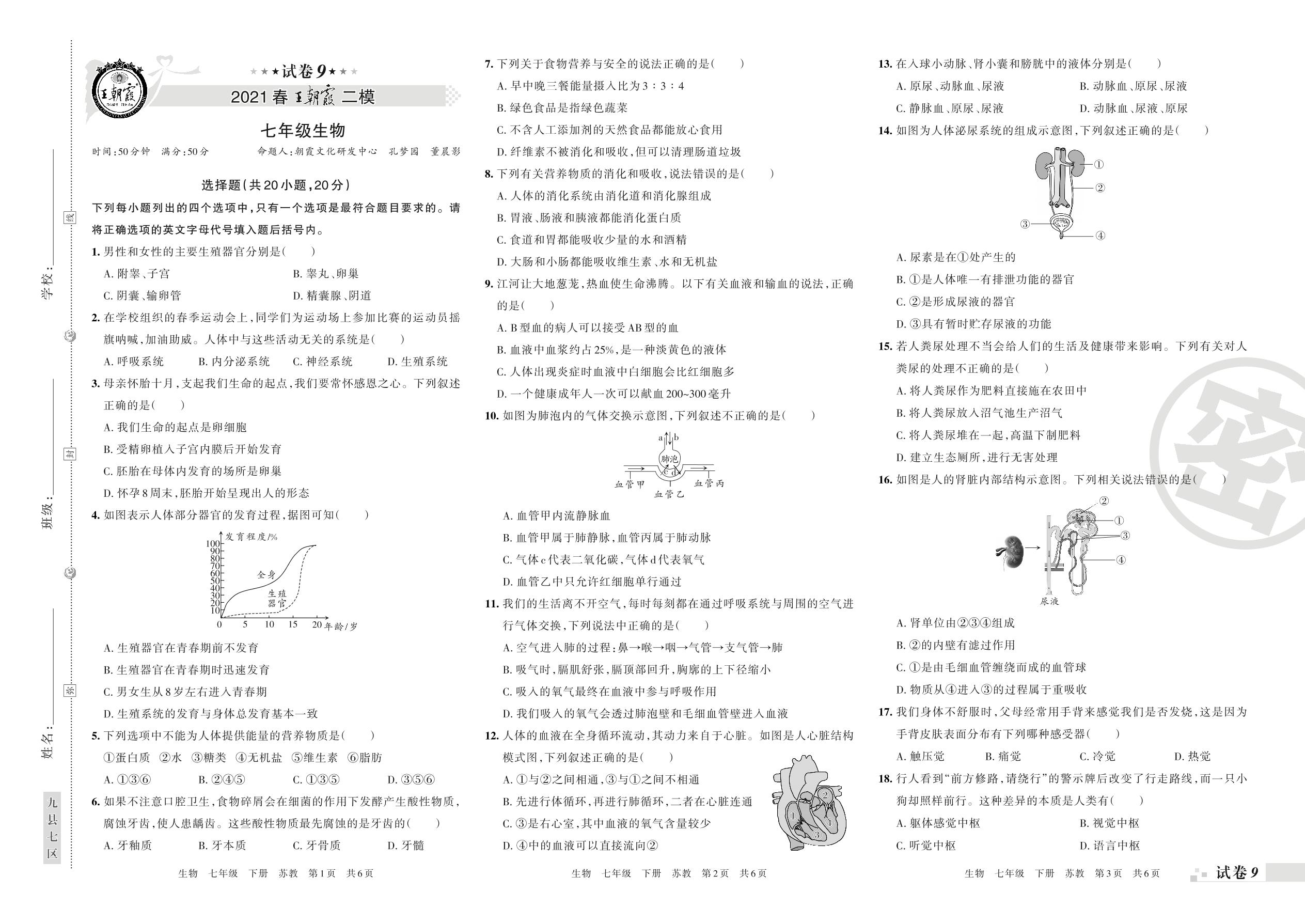 王朝霞期末模拟卷七年级下册生物(苏教版)【9】