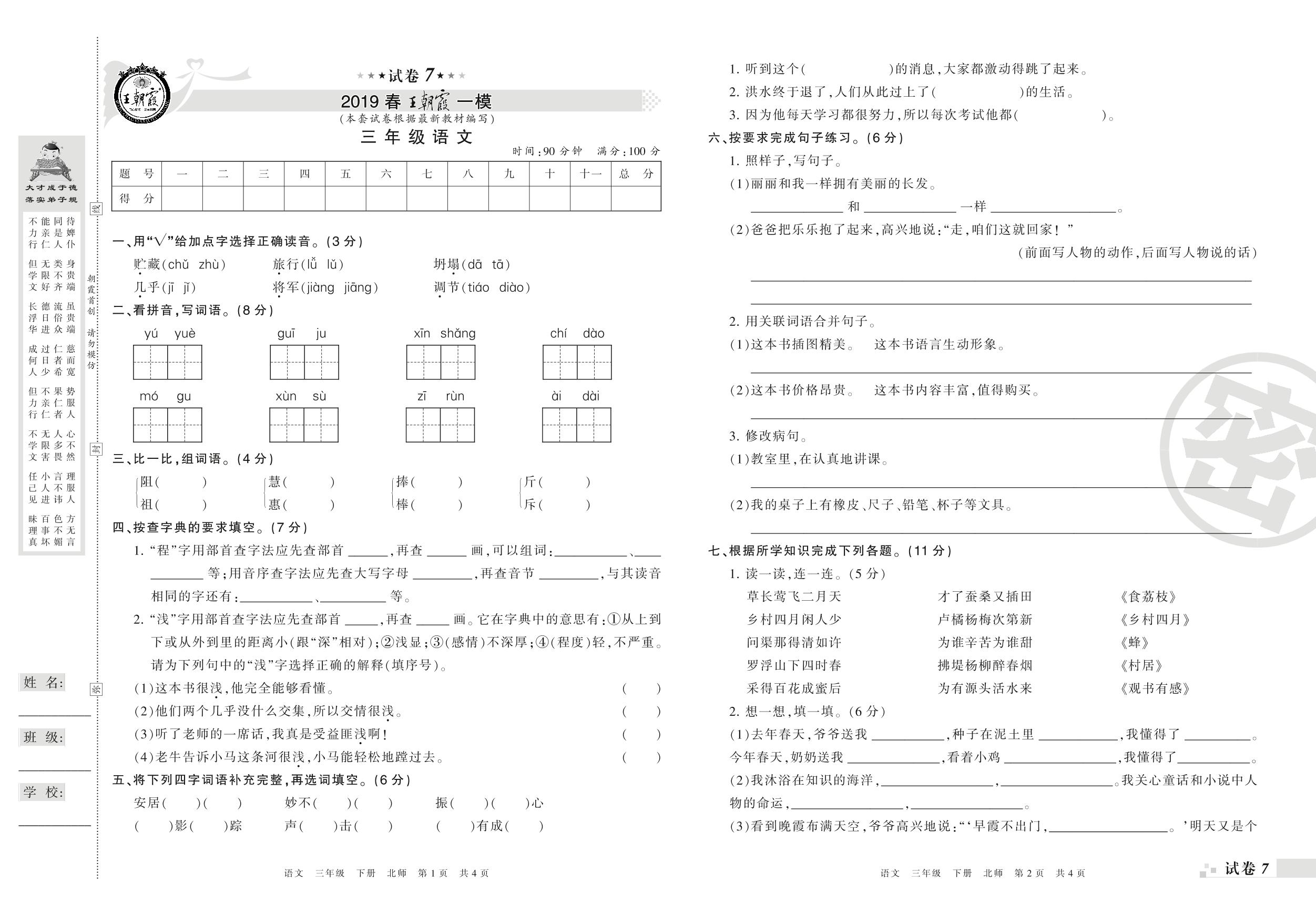 王朝霞期末模拟卷三年级下册语文(北师版)【7】