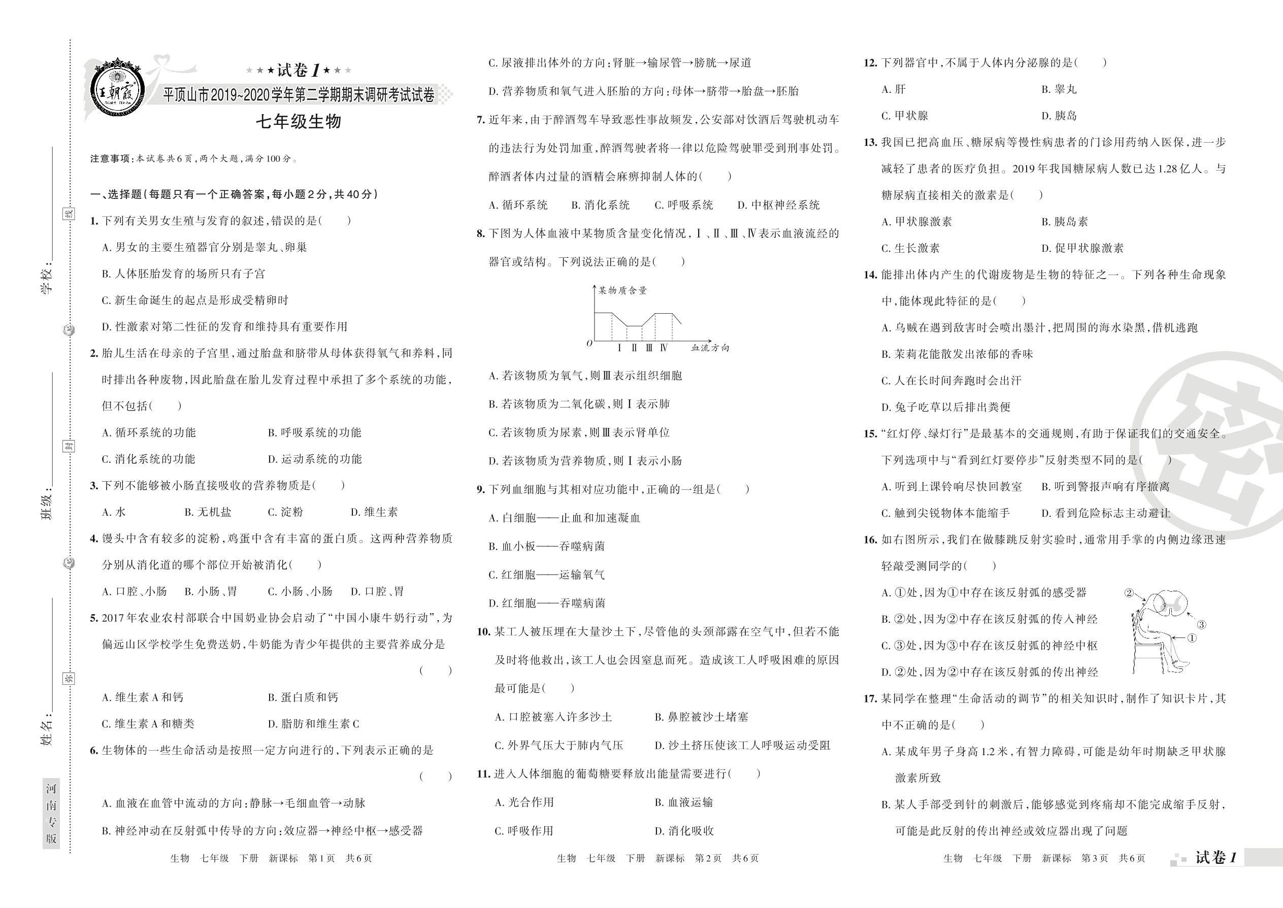2019-2020学年第二学期平顶山市七年级生物试卷(新课版)【1】