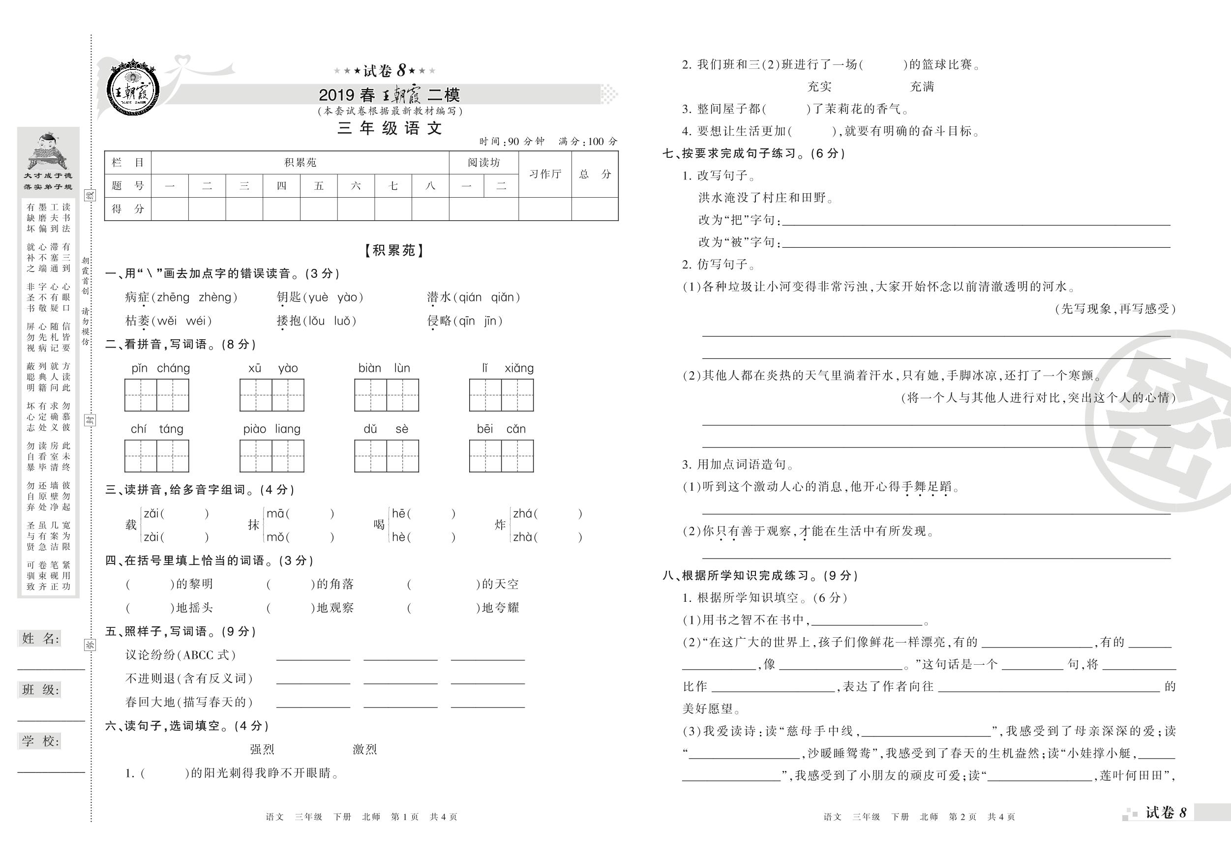 王朝霞期末模拟卷三年级下册语文(北师版)【8】