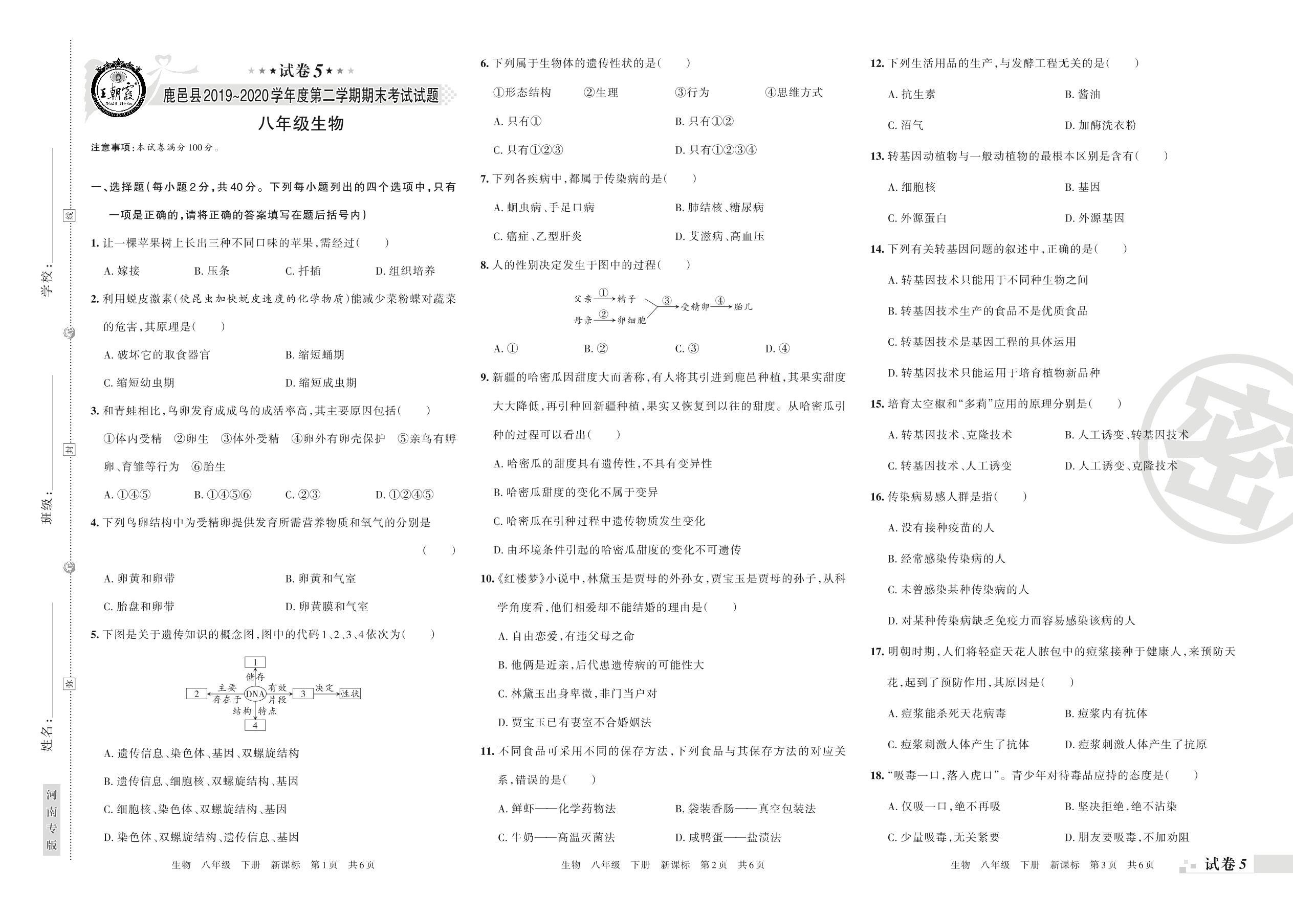 2019-2020学年第二学期周口市鹿邑县八年级生物试卷(新课版)【5】