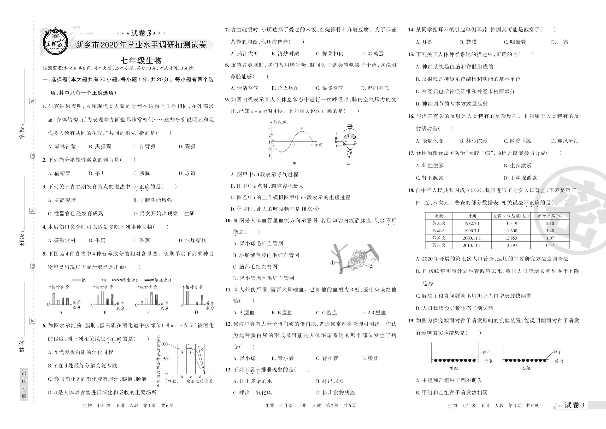 2019-2020学年第二学期新乡市七年级生物试卷(人教版)【3】