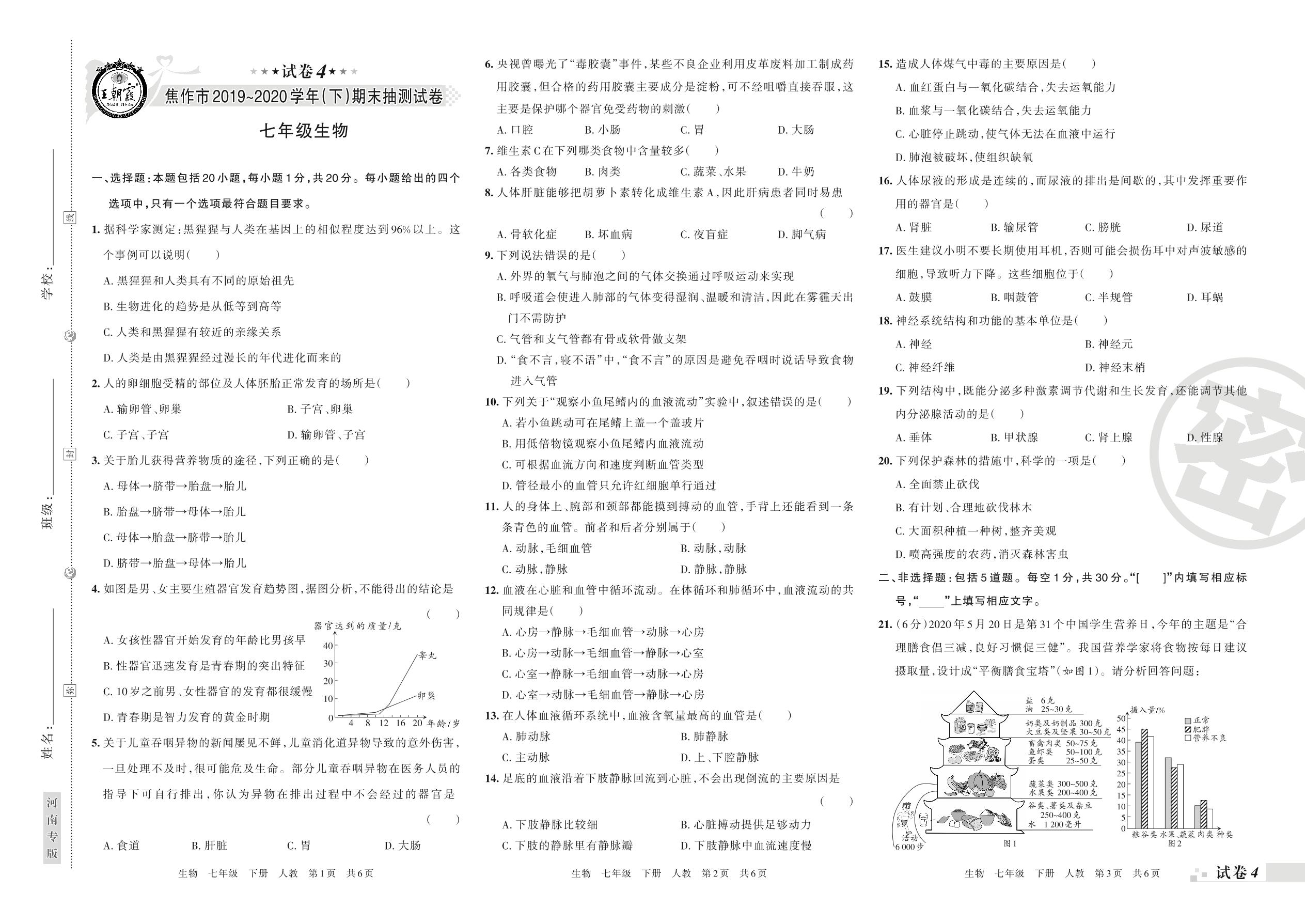 2019-2020学年第二学期焦作市七年级生物试卷(人教版)【4】