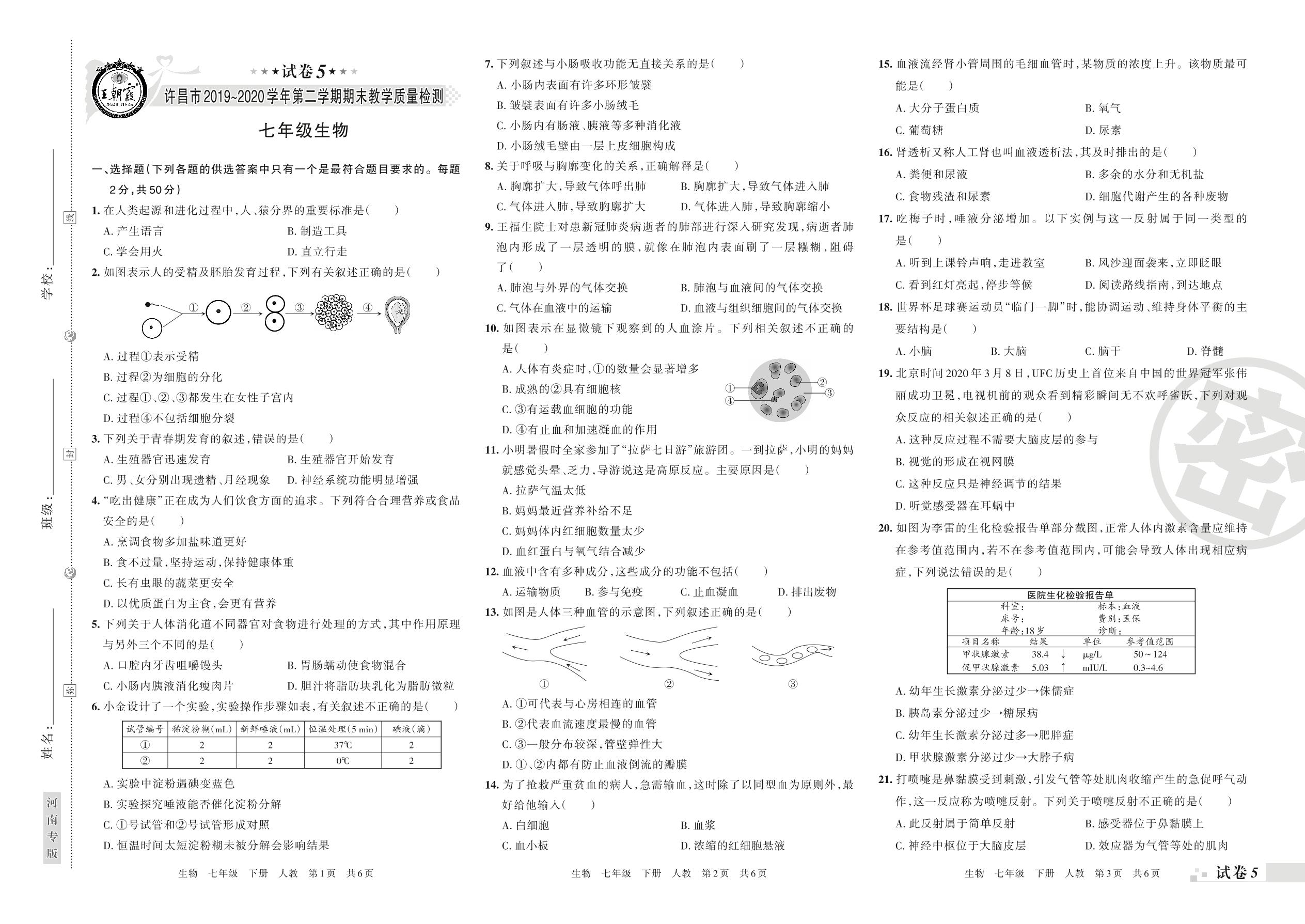 2019-2020学年第二学期许昌市七年级生物试卷(人教版)【5】
