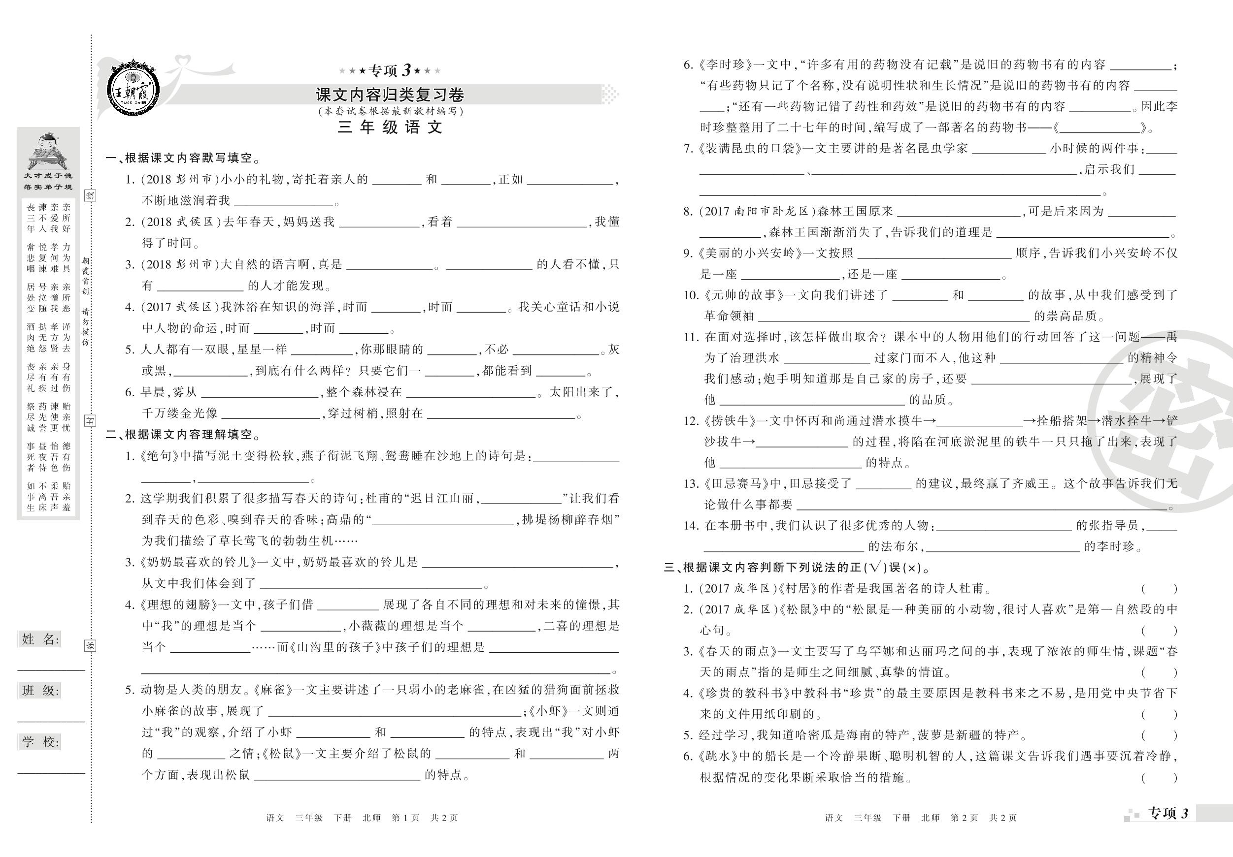 王朝霞期末专项卷——课文内容、积累运用归类复习三年级下册语文(北师版)_R21080194654【0】