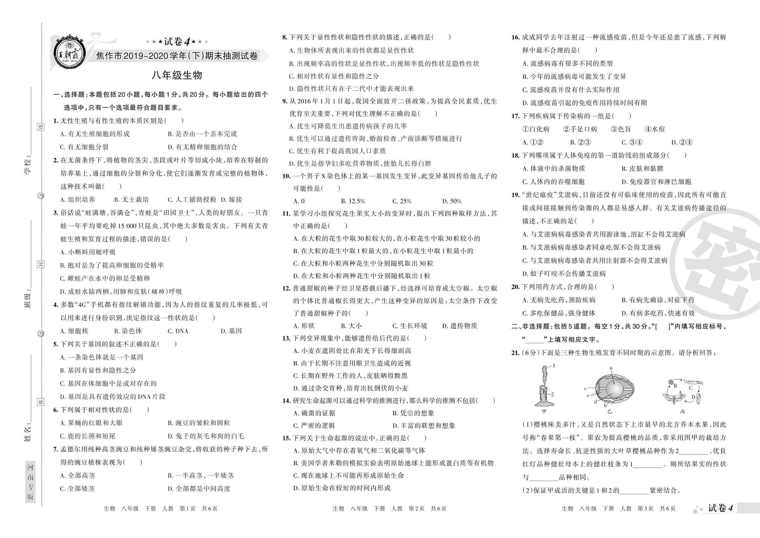 2019-2020学年第二学期焦作市八年级生物试卷(人教版)【4】