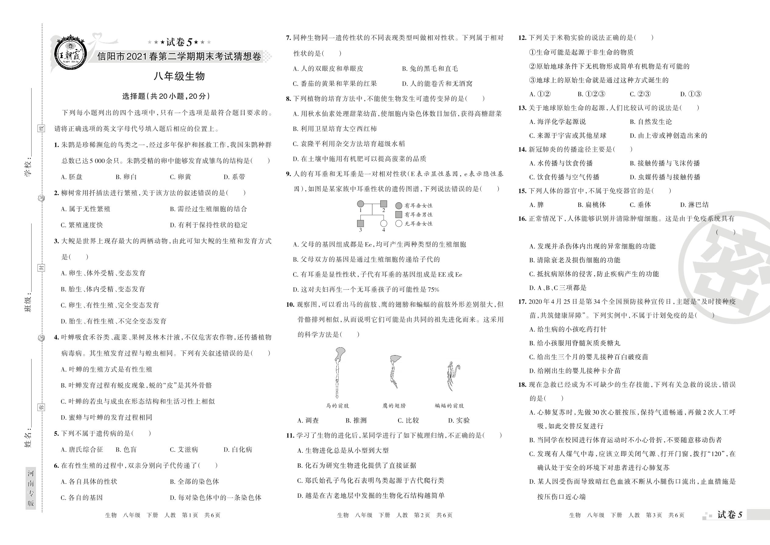 2020-2021学年第二学期信阳市八年级生物试卷(人教版)【5】