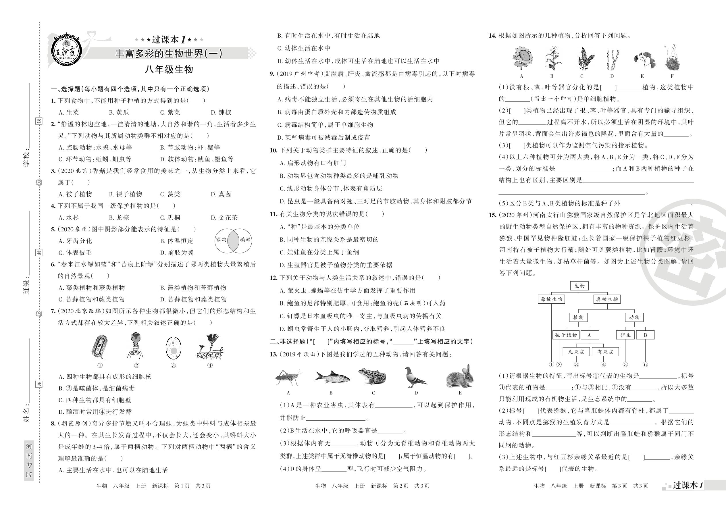 王朝霞期末过课本——丰富多彩的生物世界八年级上册生物(苏教版)【0】