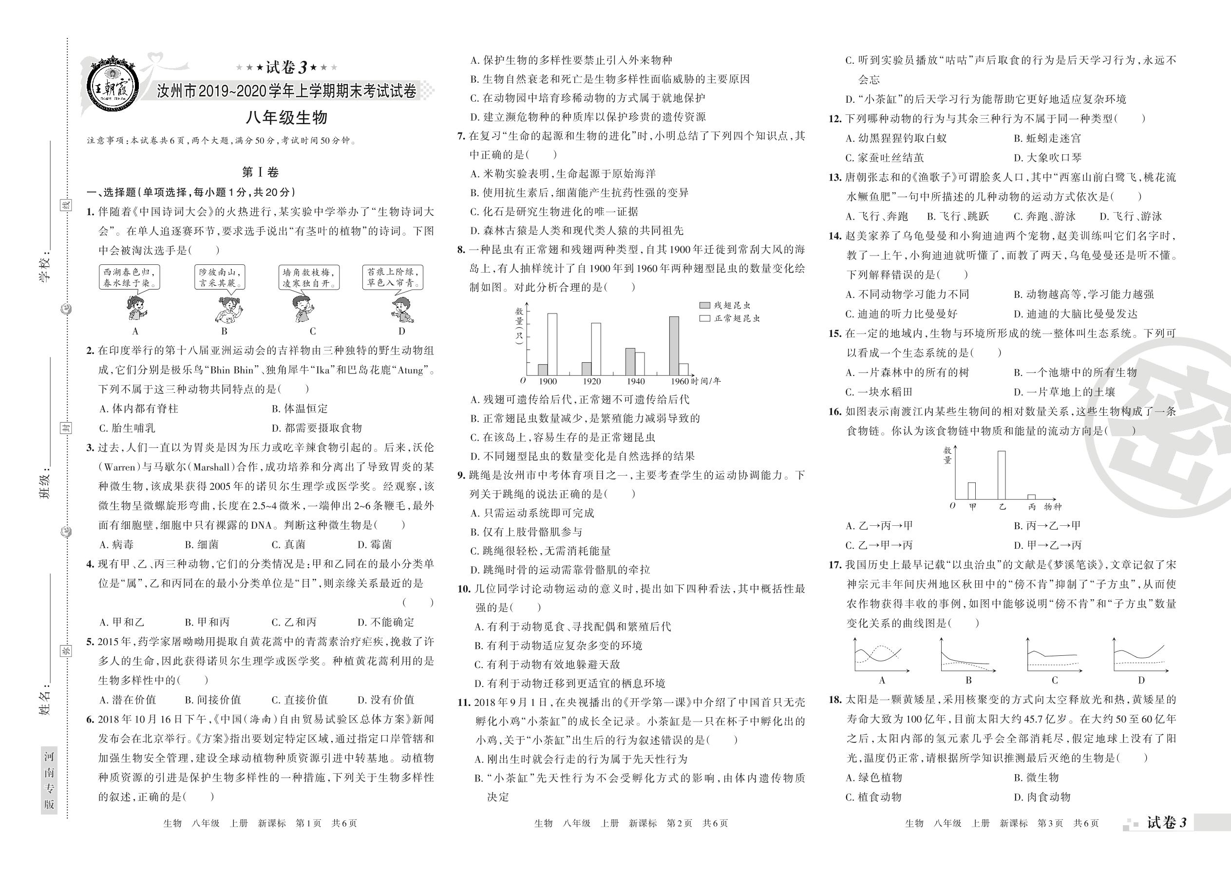 2019-2020学年第一学期汝州市八年级生物试卷(苏教版)【3】