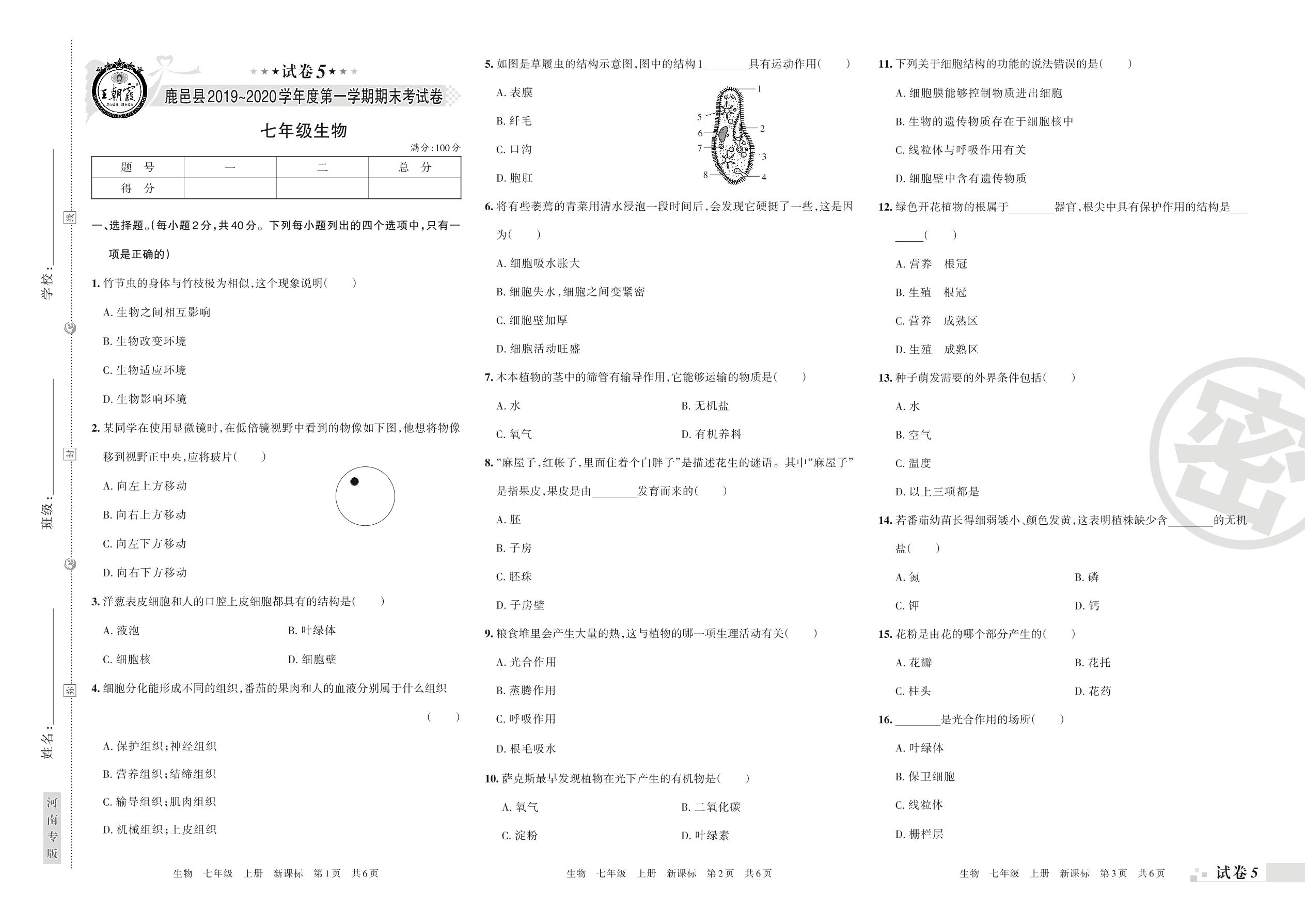 2019-2020学年第一学期周口市鹿邑县七年级生物试卷(苏教版)【5】