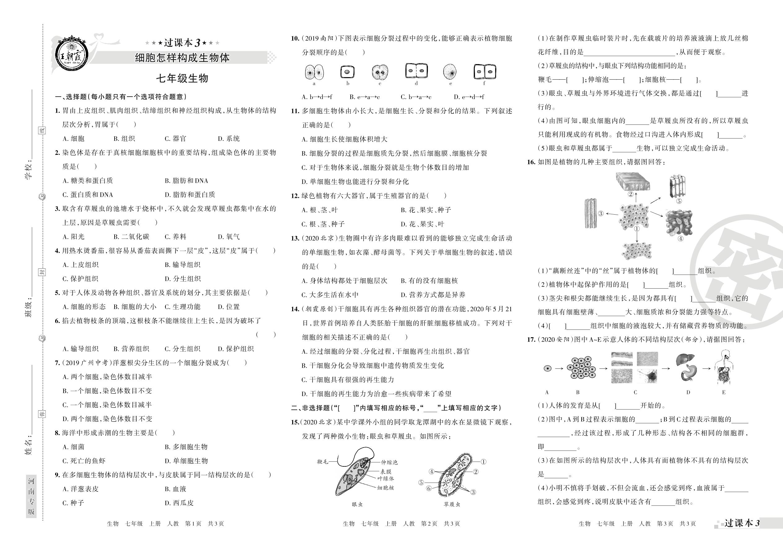 王朝霞期末过课本——细胞怎样构成生物体、生物圈中有哪些绿色植物七年级上册生物(人教版)【0】