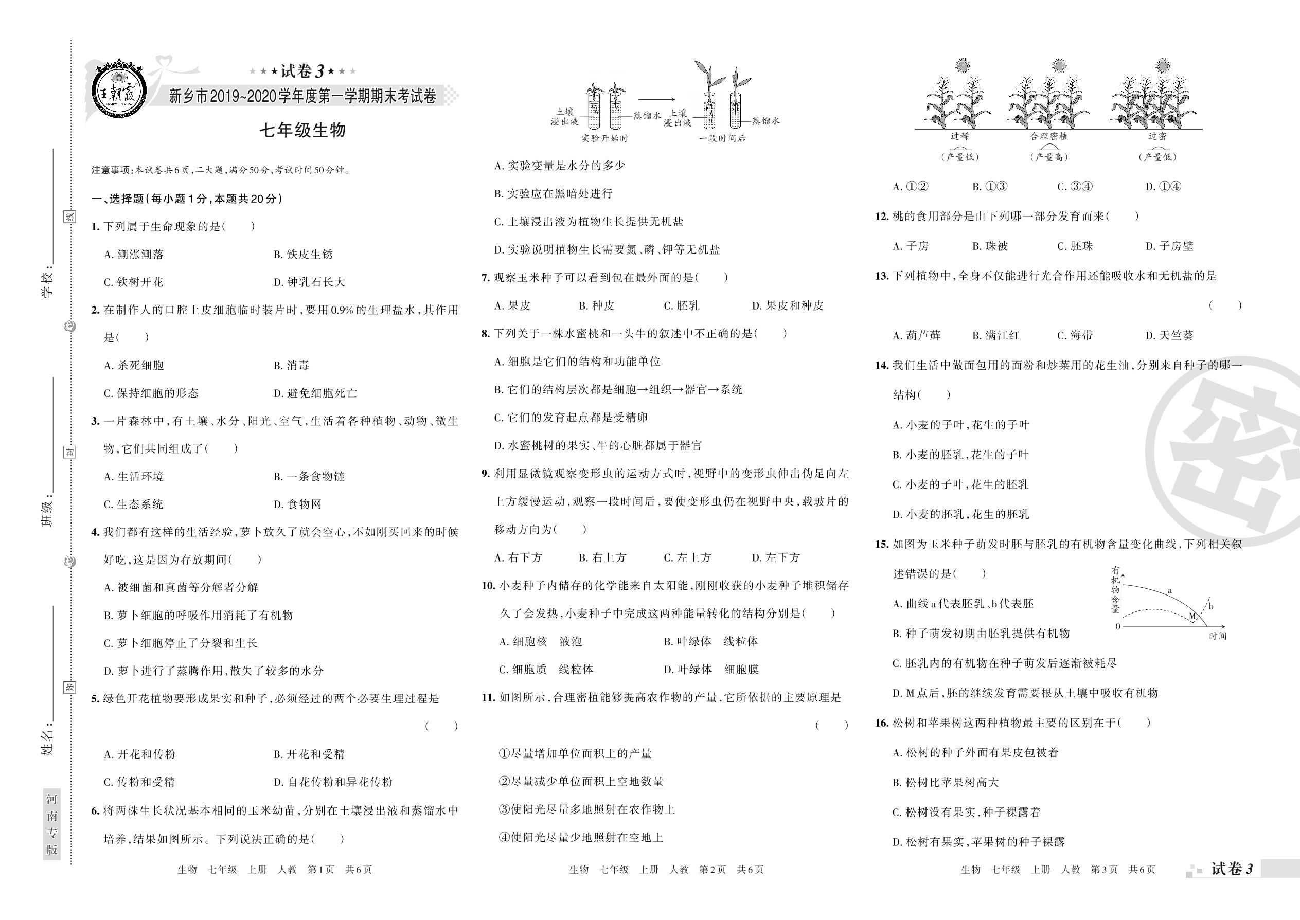 2019-2020学年第一学期新乡市七年级生物试卷(人教版)【3】