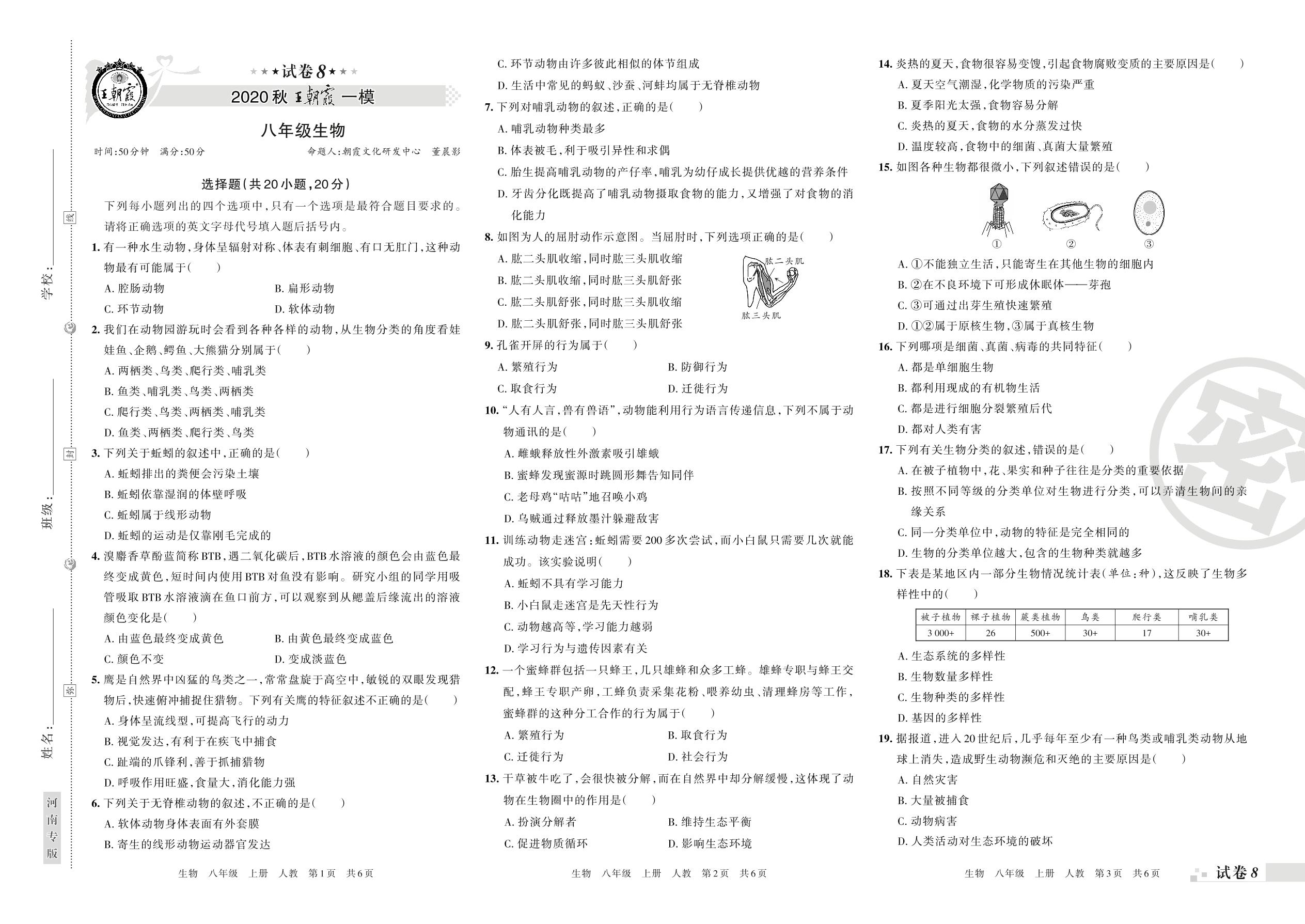 王朝霞期末模拟卷八年级上册生物(人教版)【8】