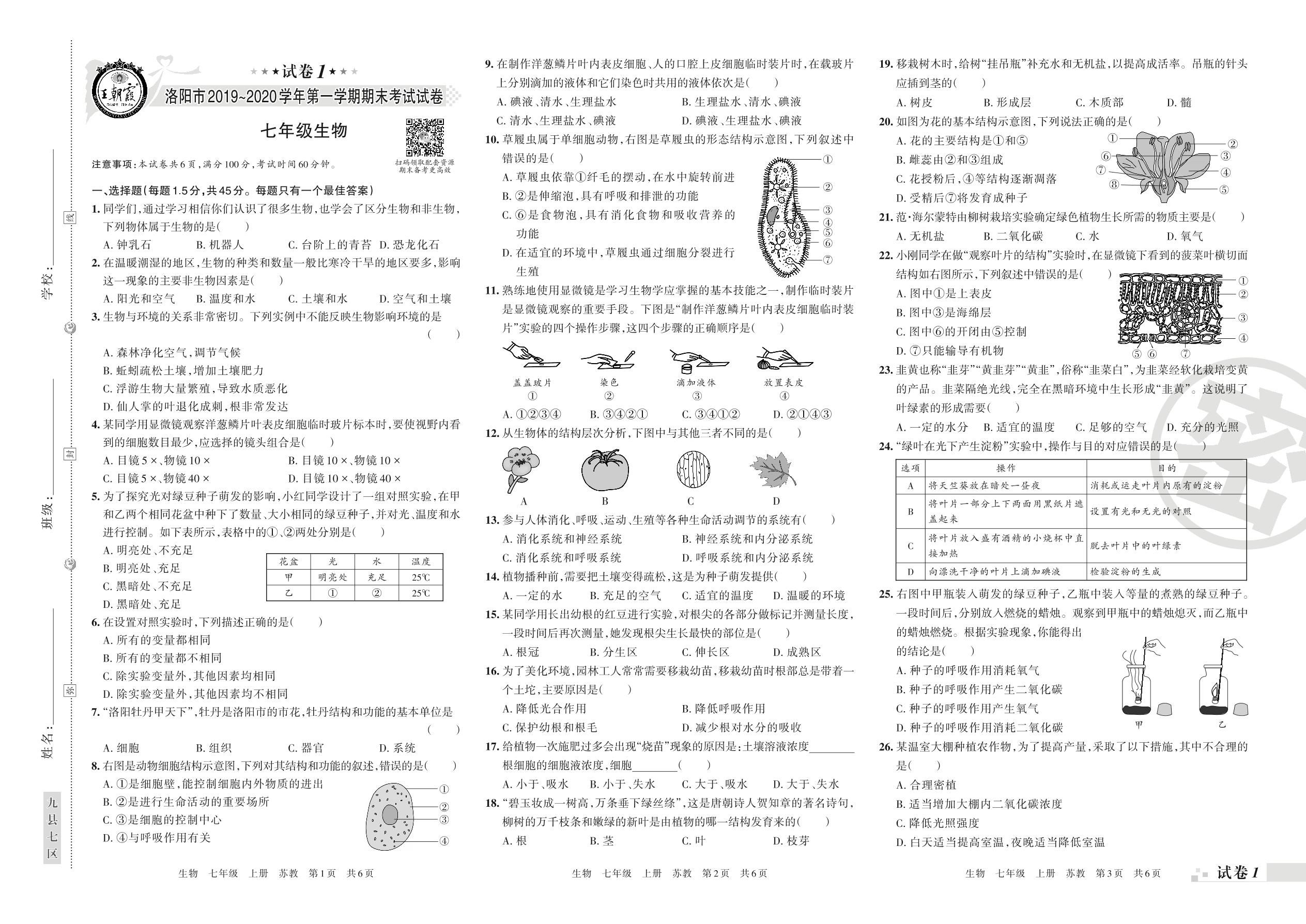 2019-2020学年第一学期洛阳市七年级生物试卷(苏教版)【1】
