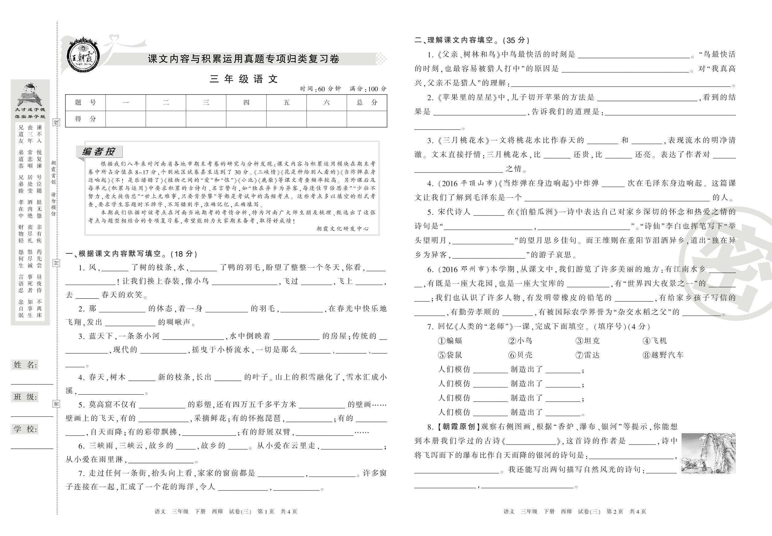 王朝霞期末专项卷三年级下册语文(西师版)_R21080194720【3】