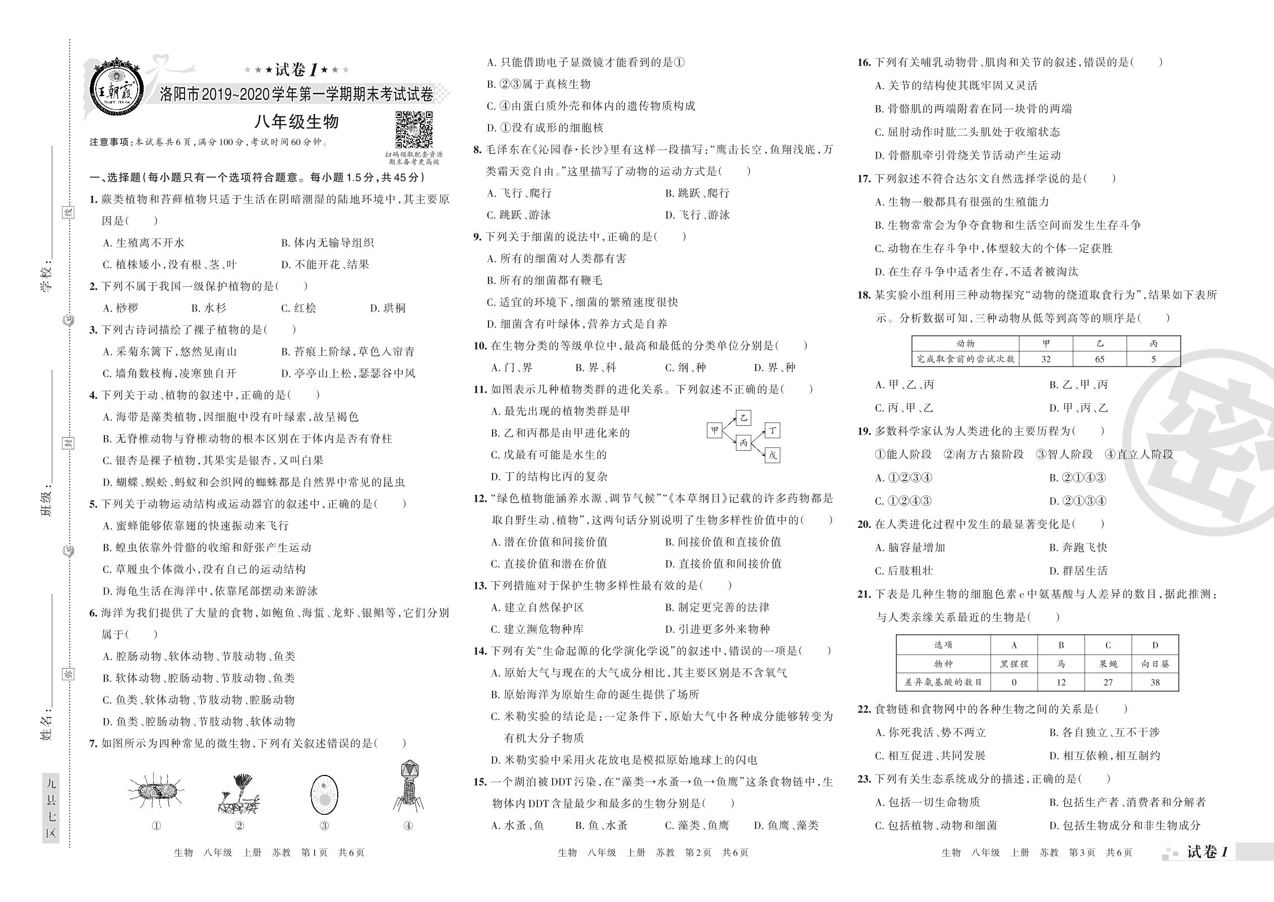 2019-2020学年第一学期洛阳市八年级生物试卷(苏教版)【1】