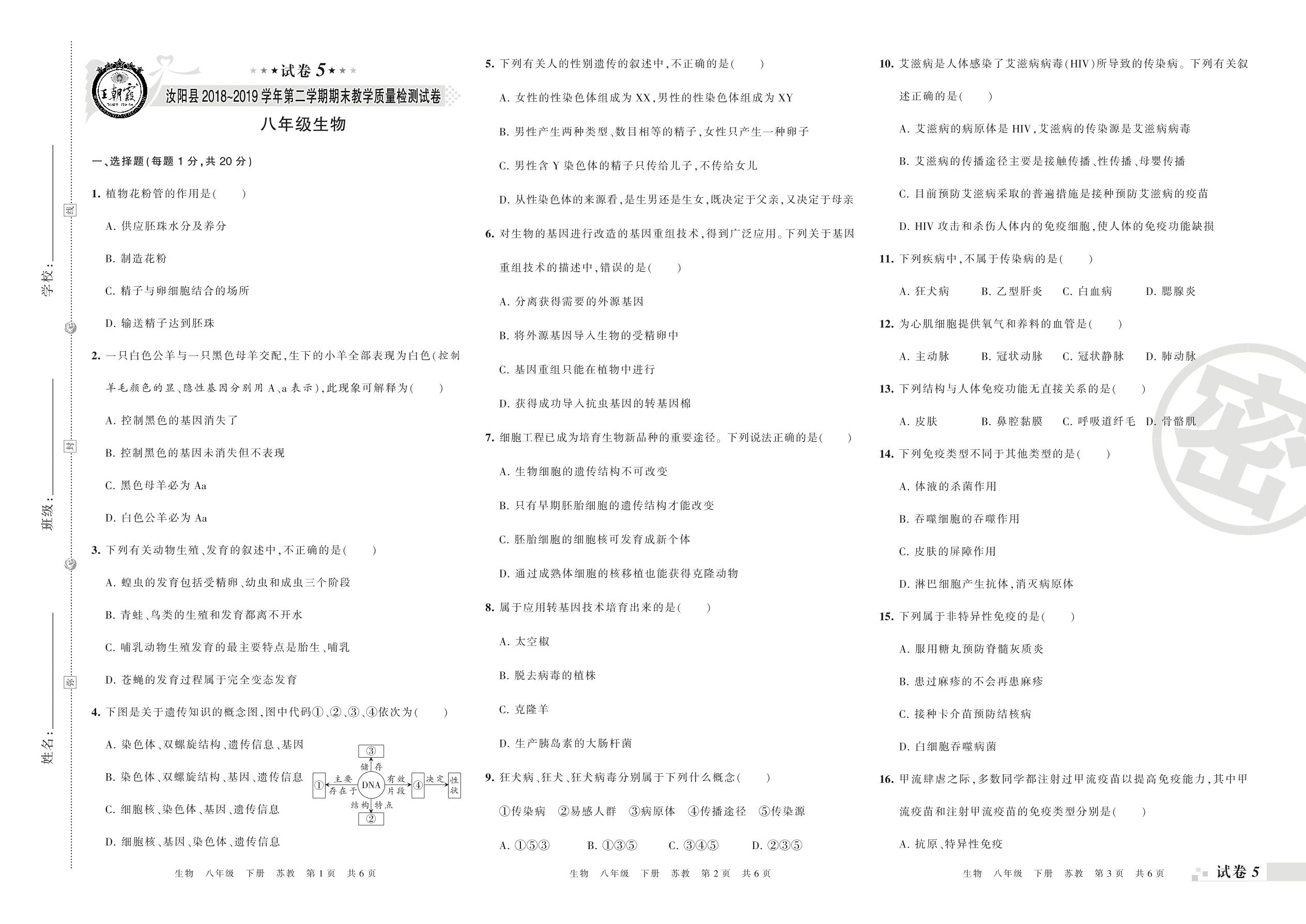 2018-2019学年第二学期洛阳市汝阳县八年级生物试卷(苏教版)【5】