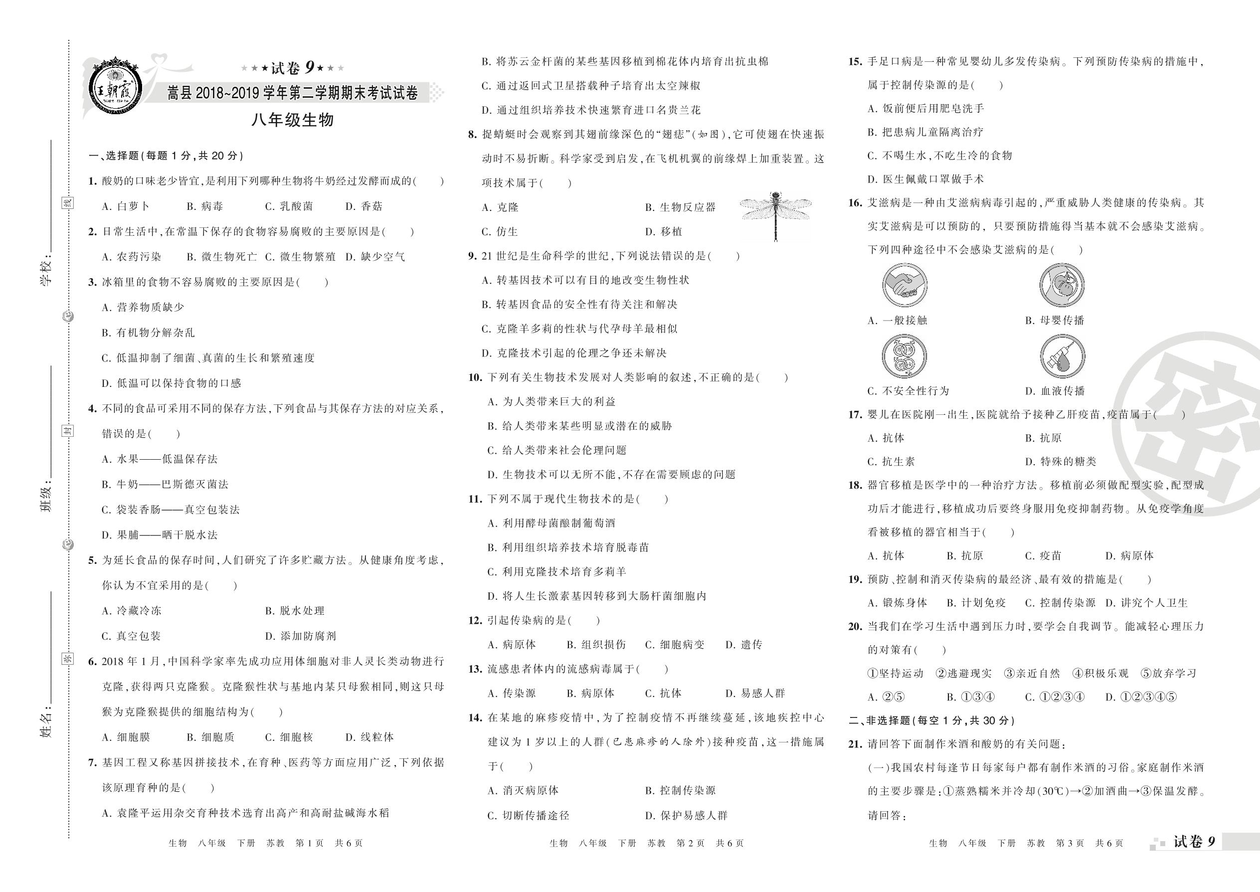2018-2019学年第二学期洛阳市嵩县八年级生物试卷(苏教版)【9】