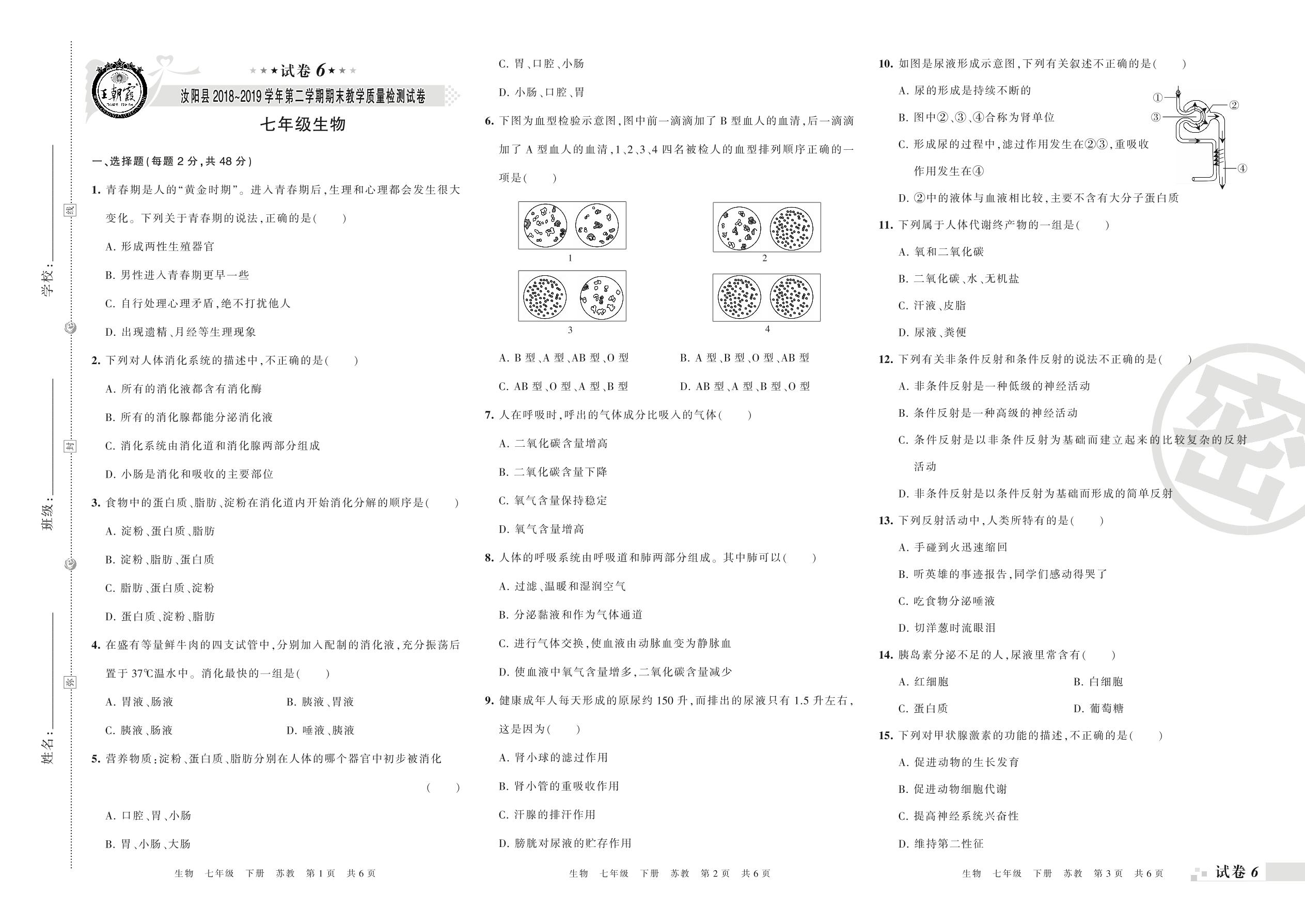 2018-2019学年第二学期洛阳市汝阳县七年级生物试卷(苏教版)【6】